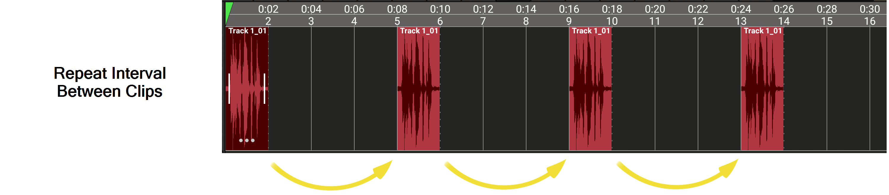 Repeat allows you to create multiple repeats of the selected clip on the track. As can be seen below, pressing Repeat opens a dialog which allows you to specify the number (#) of repeats and if you want to specify intervals at which the repeats will appear you can also do that too. The drop-down intervals selection allows you to choose between Seconds, Milliseconds, Bars, Beats, 1/8 Notes and 1/16 Notes.