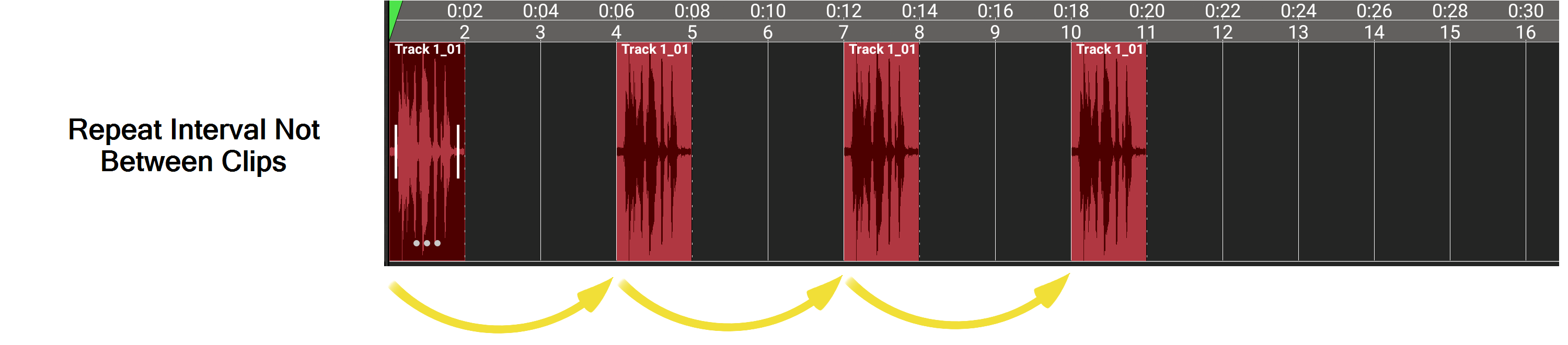 As you can see there is also a 'Between clips' checkbox. If checked, the selected amount of interval will be applied between each repeated clip. If it is NOT checked, the selected amount of interval will be applied based on the start position of the clip being copied and so on for every subsequent repeat.