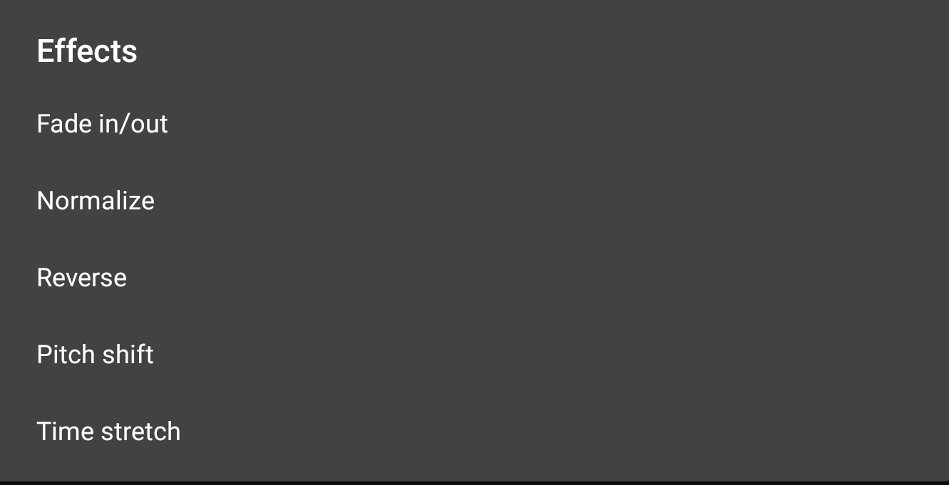 Apply effects (fades, normalize...) is where you can apply various types of processing to the audio clip. These effects differ from those on the FX Grid in that the processing is applied to the audio waveform and then rendered/saved directly to a copy of the original audio file. You can always undo this process which will swap out the processed clip by the original clip. Pressing the Apply effects option opens the Effects selection dialog seen here.