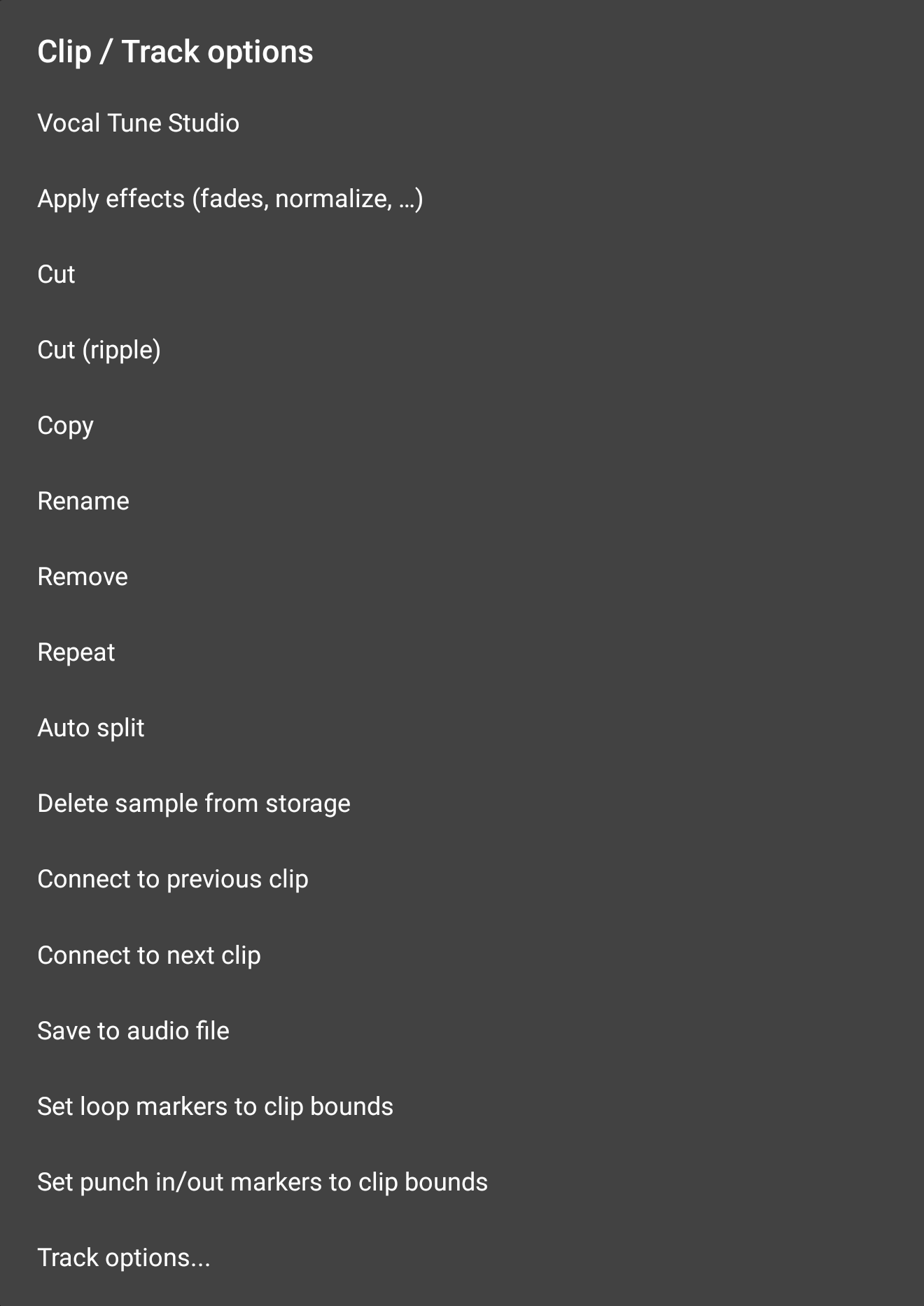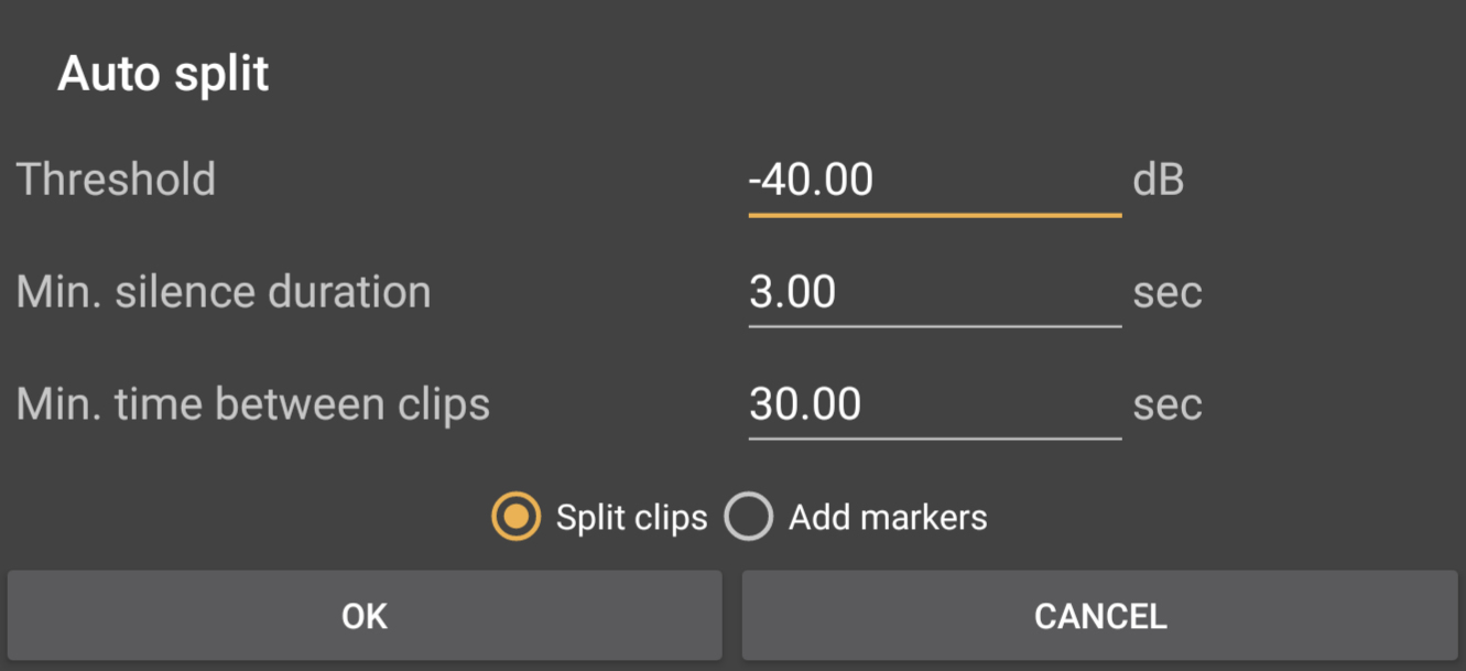Auto split (Android only) enables you to automatically split your clip into separate clips, or have markers placed accordingly, based on the values you enter in the Auto split dialog shown below. When the sound in the clip matches the criteria defined in the dialog, a new clip will be created at that point or a marker will be created on the timeline/marker display at that point if you'd prefer that. This can be very useful if, for example, you've made a long live recording and you want to easily split it into separate songs/tracks. Likewise, if you've made a long recording of a meeting or a lecture and you want to easily identify any moments of silence to then remove them, this can be help with that. And if you want to grab individual sounds from a sample containing multiple sounds, you can use auto split to easily separate them into their own clips.