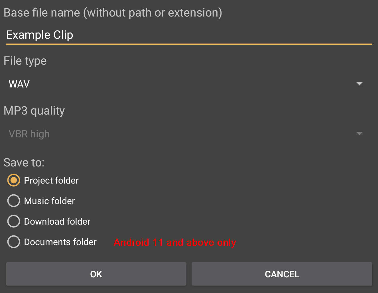 - Export to allows you to select the destination folder for the exported file. You can choose to save the audio file to either the Project folder (where it can be found in the 'Samples' folder), the device Music folder, the device Download folder or (Android 11 and above only) the device Documents folder.