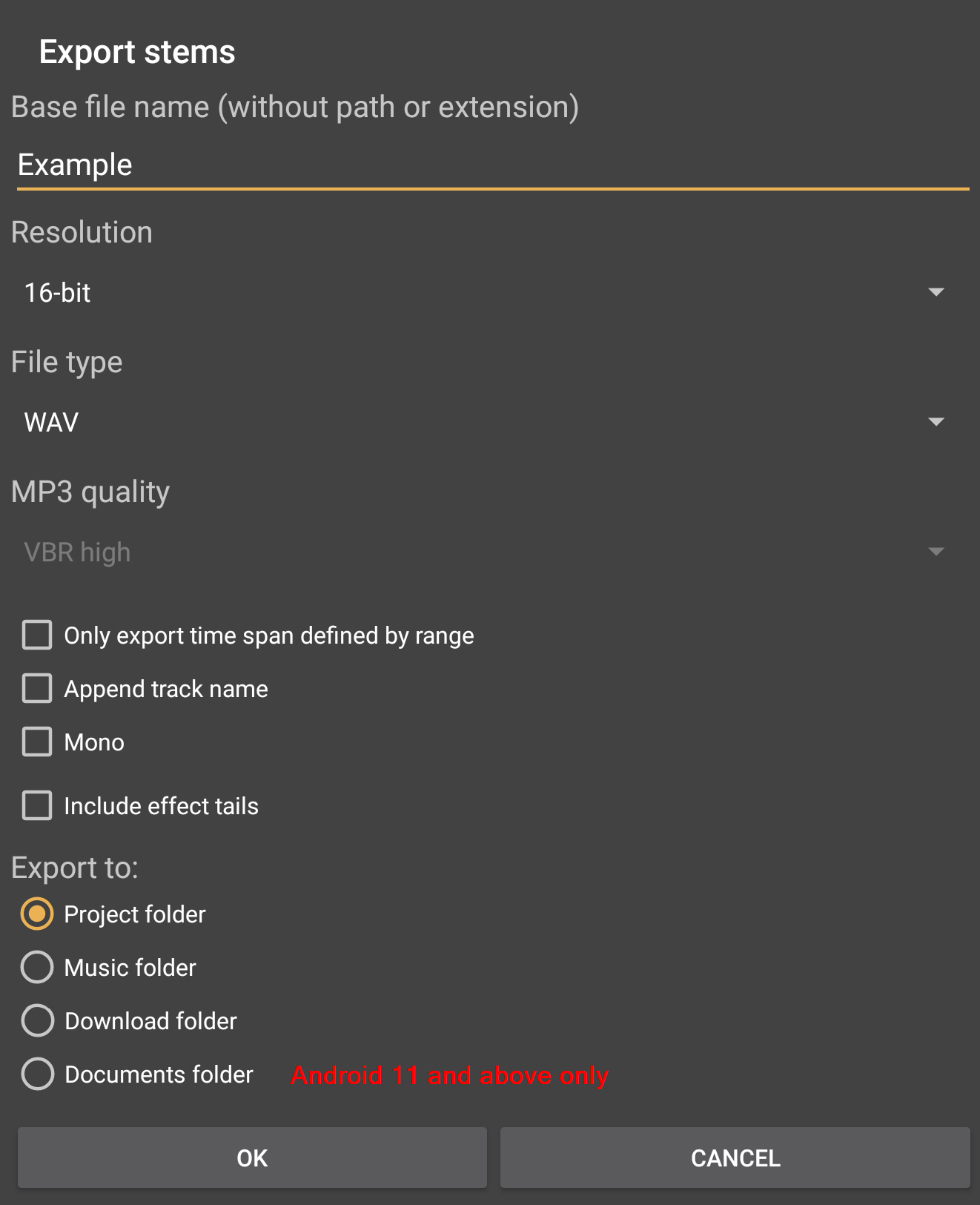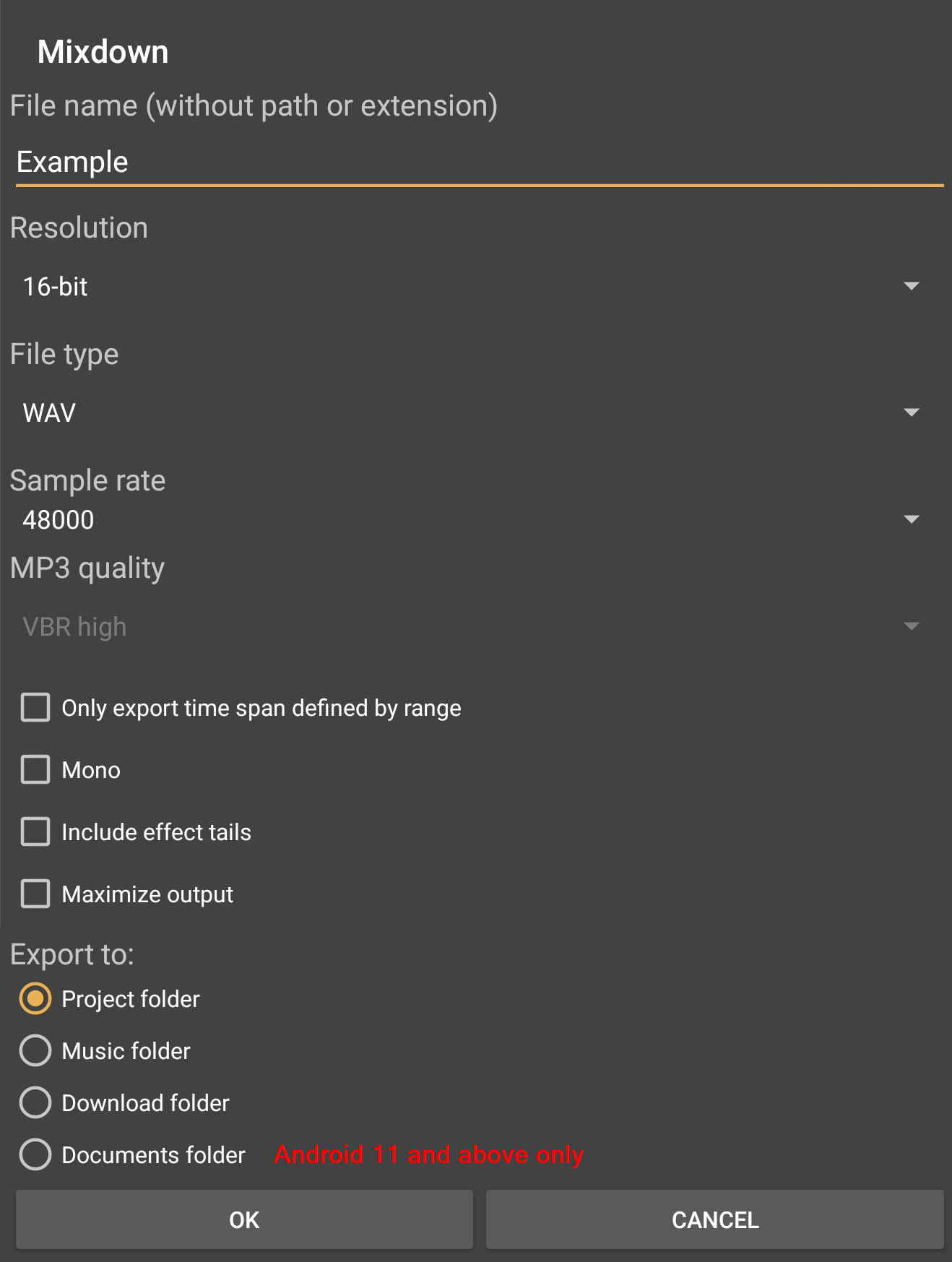 - Documents folder (Android 11 and above only) will place the exported mixdown in your device's Documents folder.