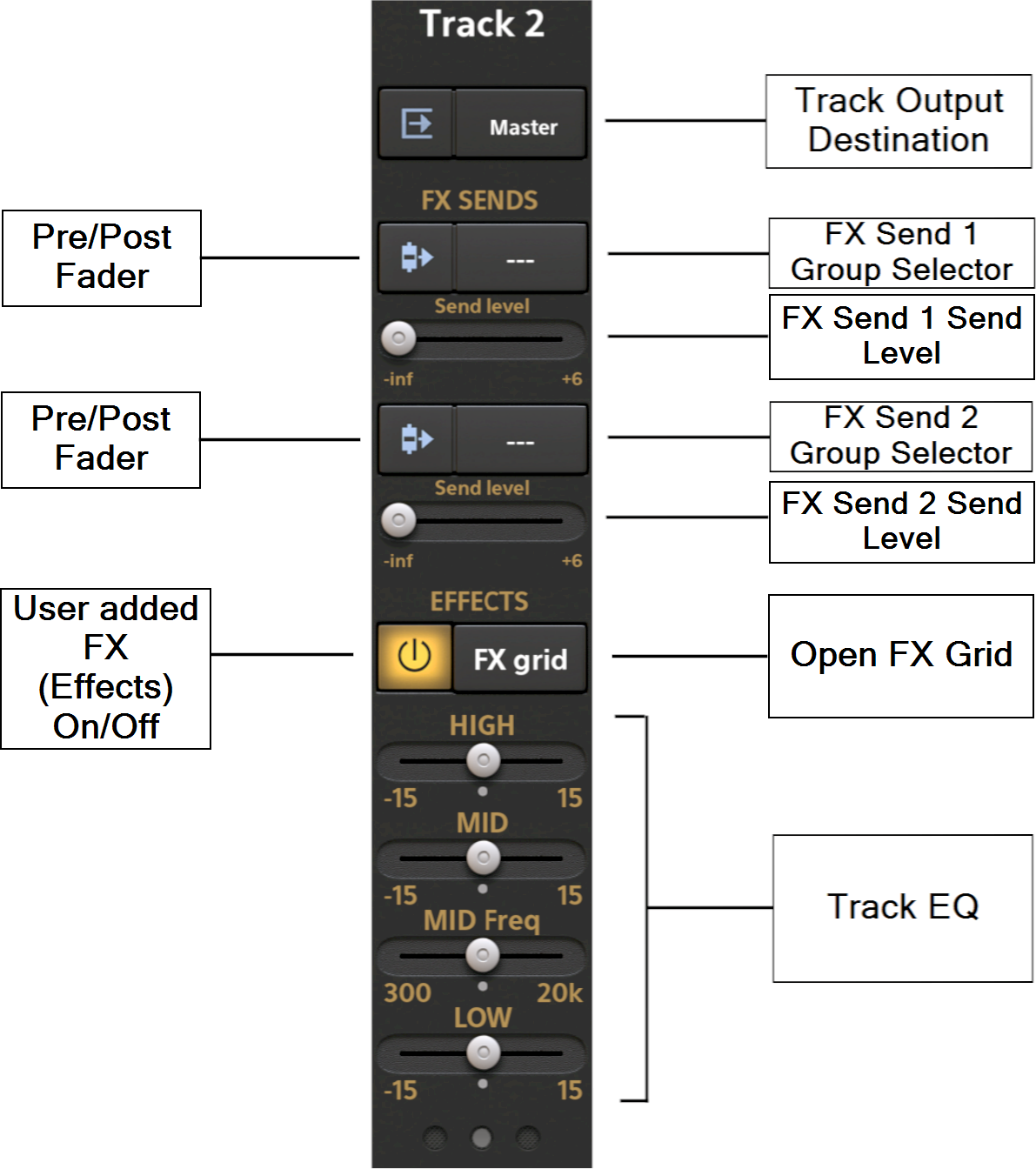 button, on the right, displays the FX (Effects) Grid for the selected track. The FX Grid allows you to insert effects, either in serial or in parallel, and add additional FX Sends should you require them for the selected track. As already described, some of the blocks shown on the grid represent controls which are simultaneously available on the track's channel strip. For more information on the FX Grid, see here.