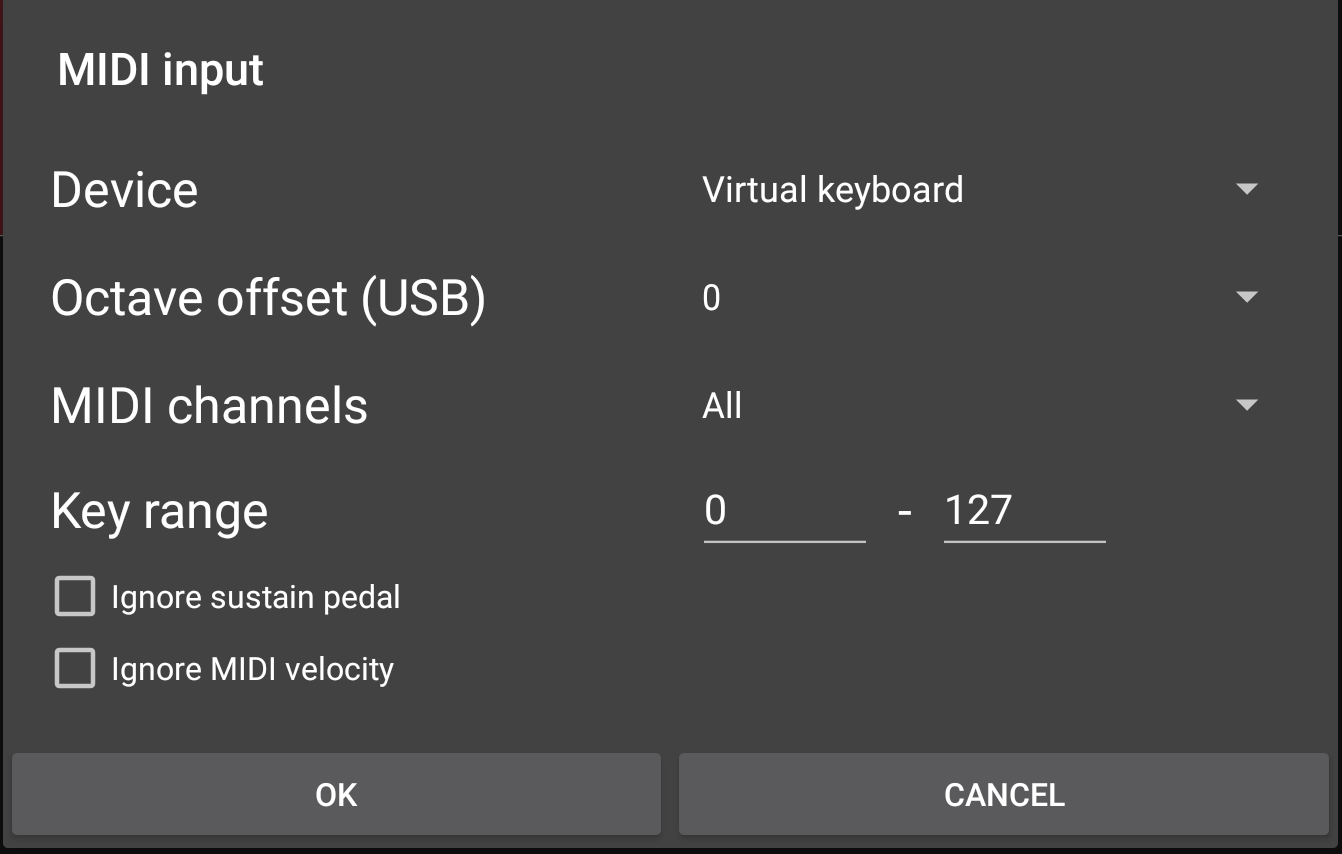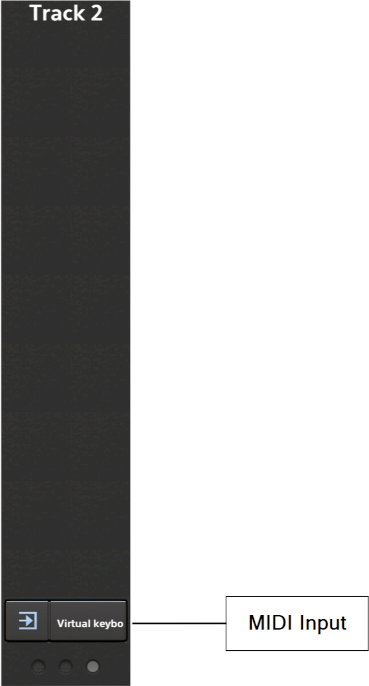 button opens the following dialog to allow you to specify the MIDI input options for the selected track. This is where you can select whether the Virtual keyboard or the Drum pads are displayed onscreen for playing the selected virtual instrument (this will only have effect when using a MIDI instrument track, not a Drum Pattern track since the latter requires to enter (quantized) MIDI events through the pattern editor). You can also select any connected MIDI device as the MIDI input for the track.