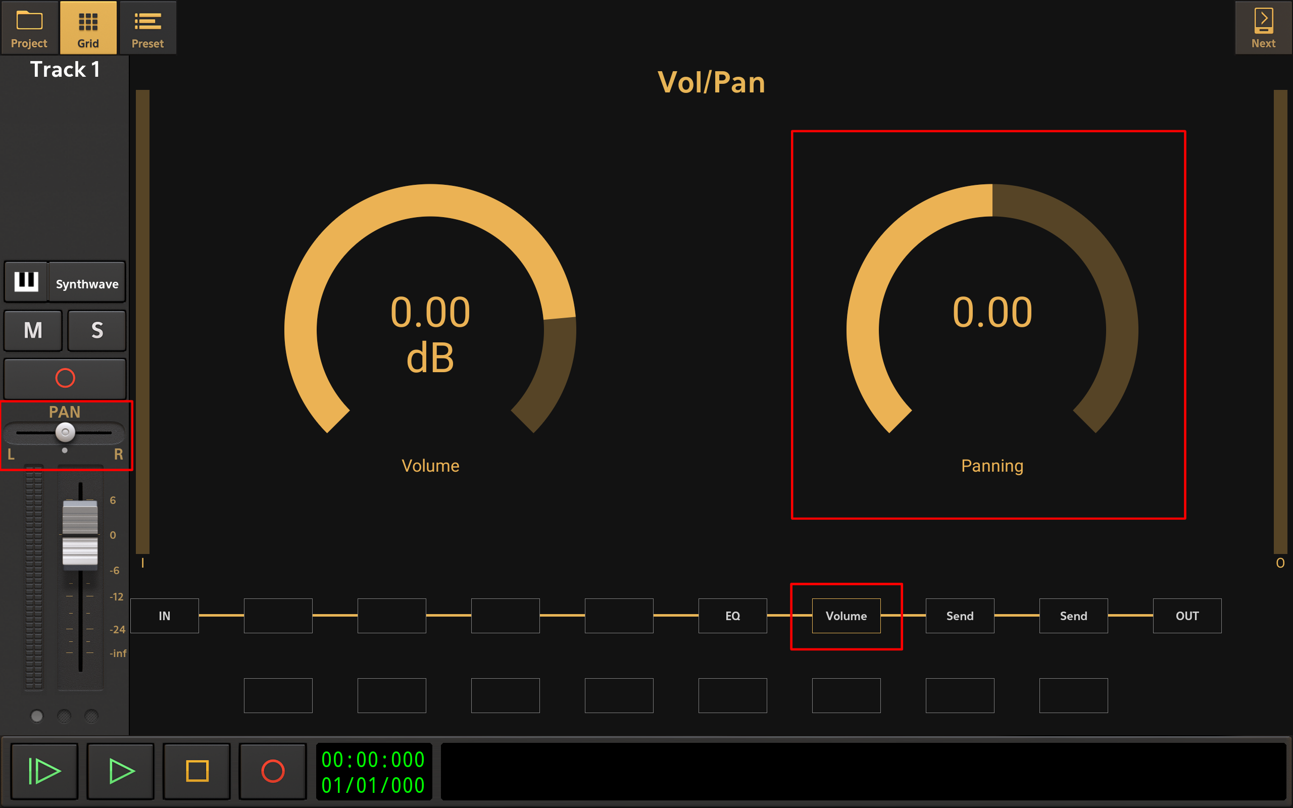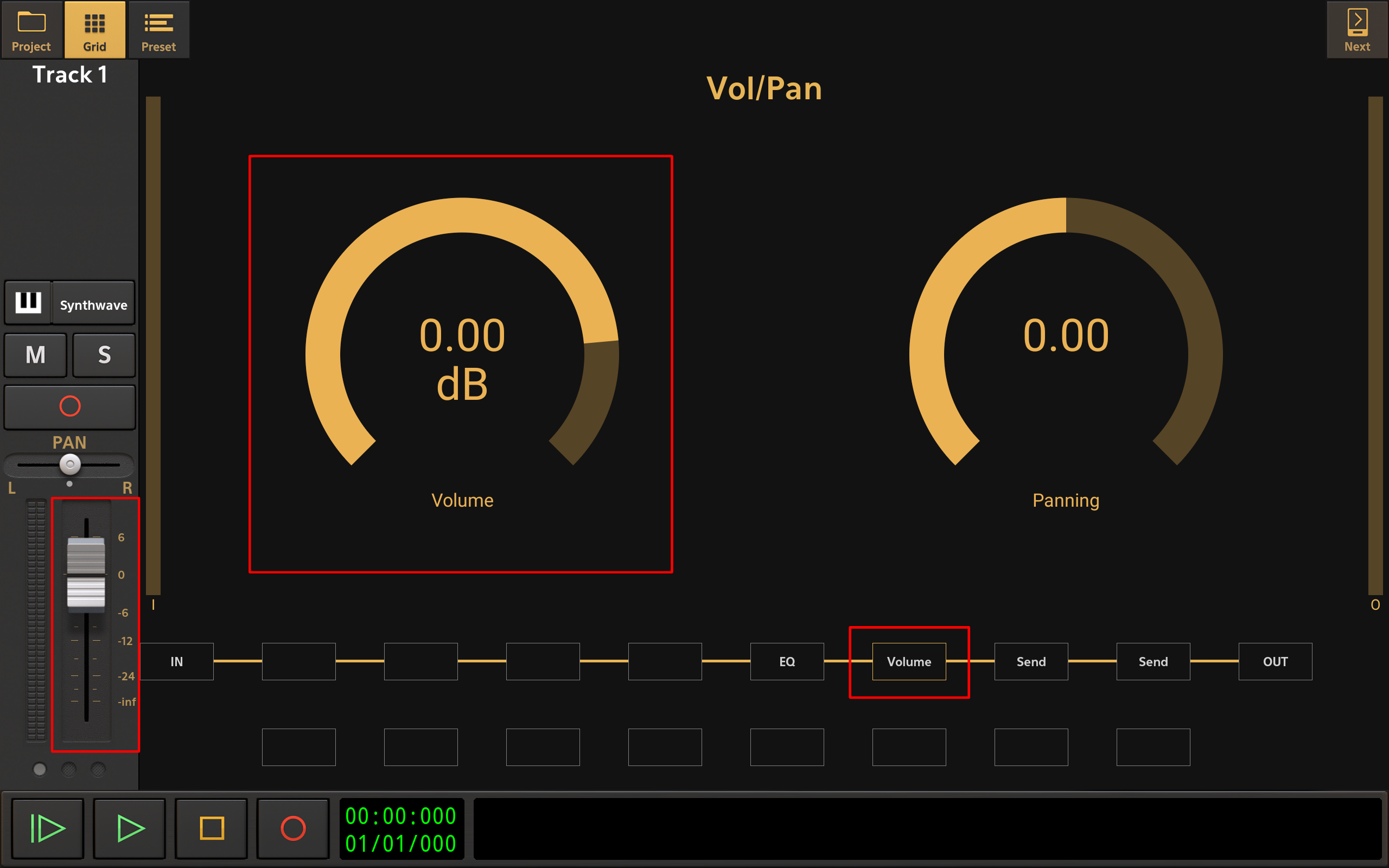 allows you to adjust the volume level of the track within the overall mix. As mentioned above in the Pan section, the volume fader controls the volume level dial in the Vol/Pan block (labeled Volume), always shown in the FX Grid and highlighted below.