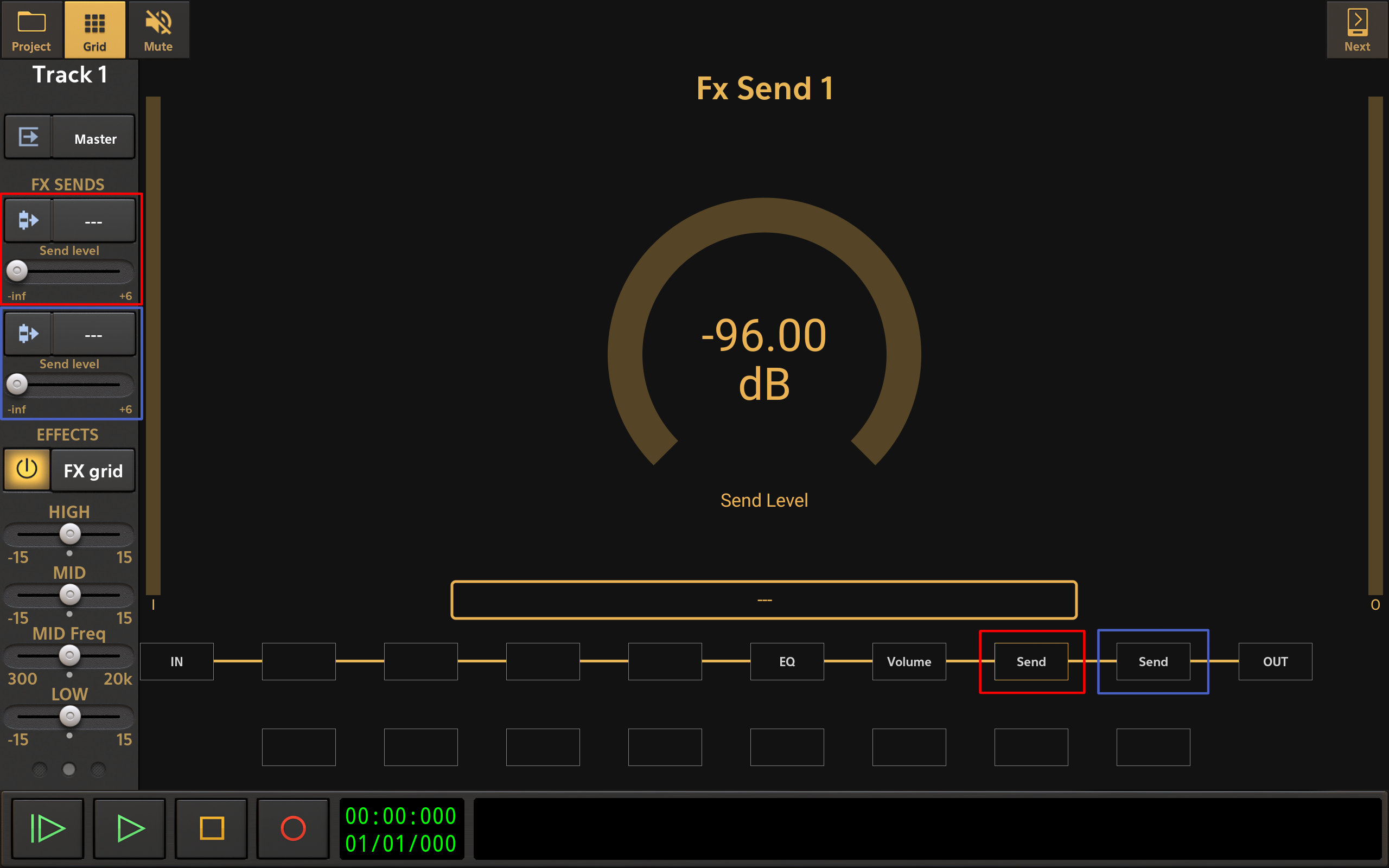 When using an FX Send, the app sends a copy of the track's audio signal to pass through the effect on the FX Return. The Send Level