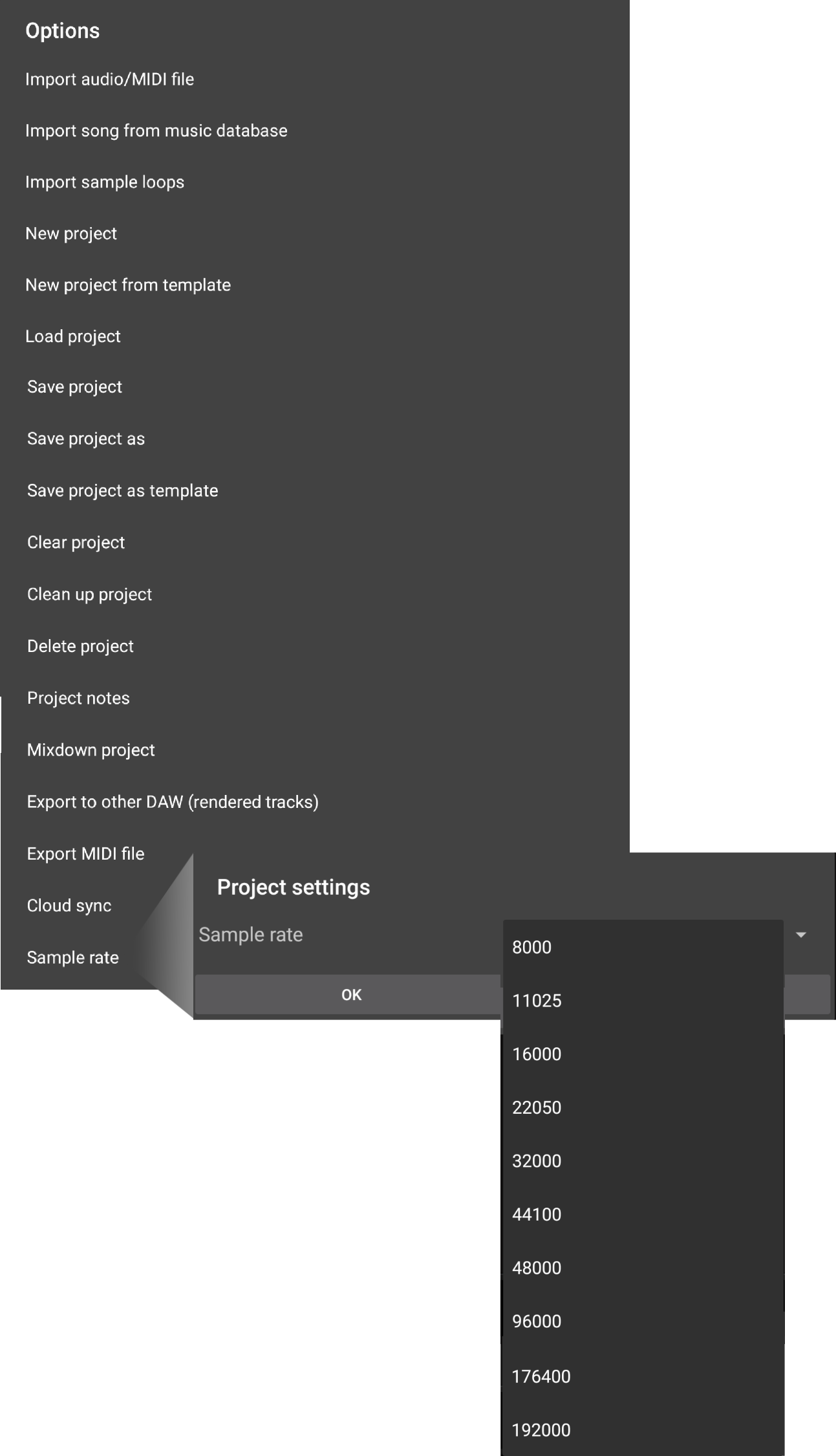 To set your project sample rate, press the Project button on the Arranger Screen. This opens the Project Options panel shown below. At the bottom of the options, Sample Rate can be selected from where you can choose from the available options.