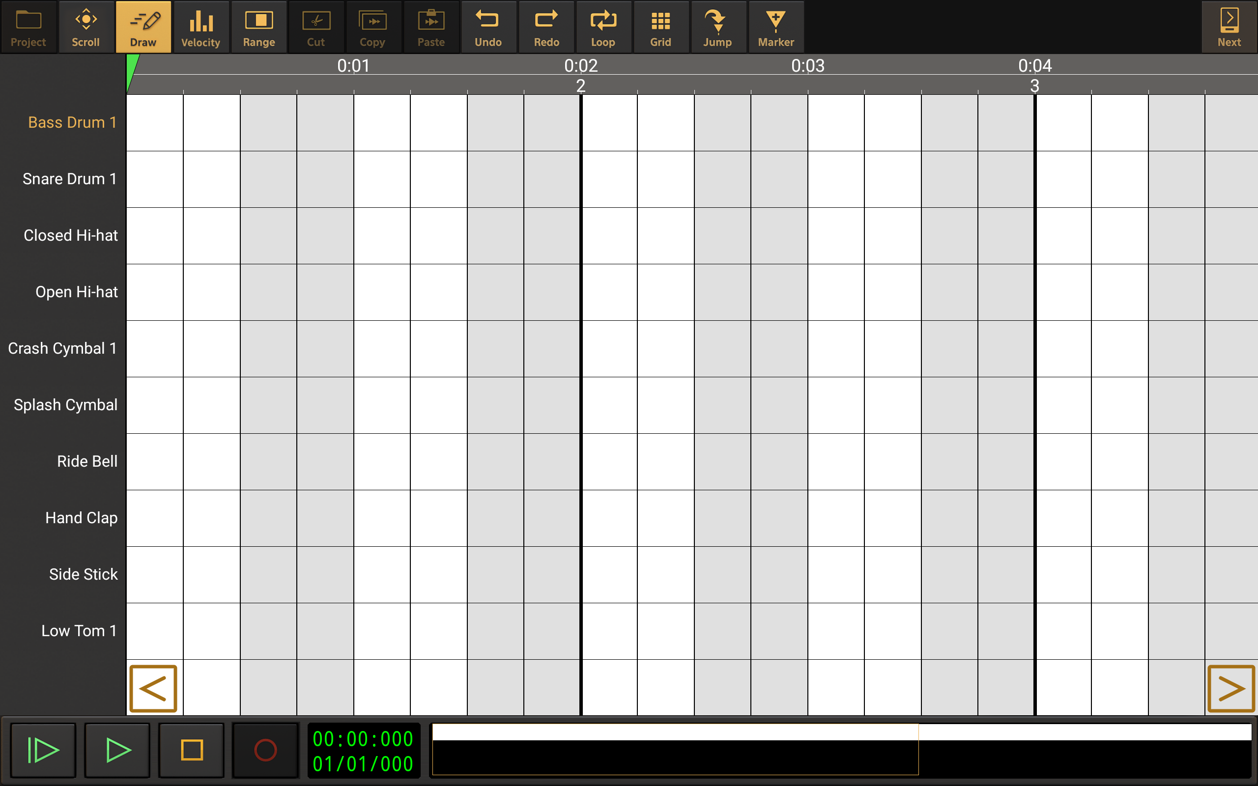 - Tap on the white/gray grid to add/remove your drum beats for each type of drum shown down the left hand side (you can scroll down to see and add more types). Each red dot will trigger the instrument displayed at the left panel. Click on the Play from beginning of project