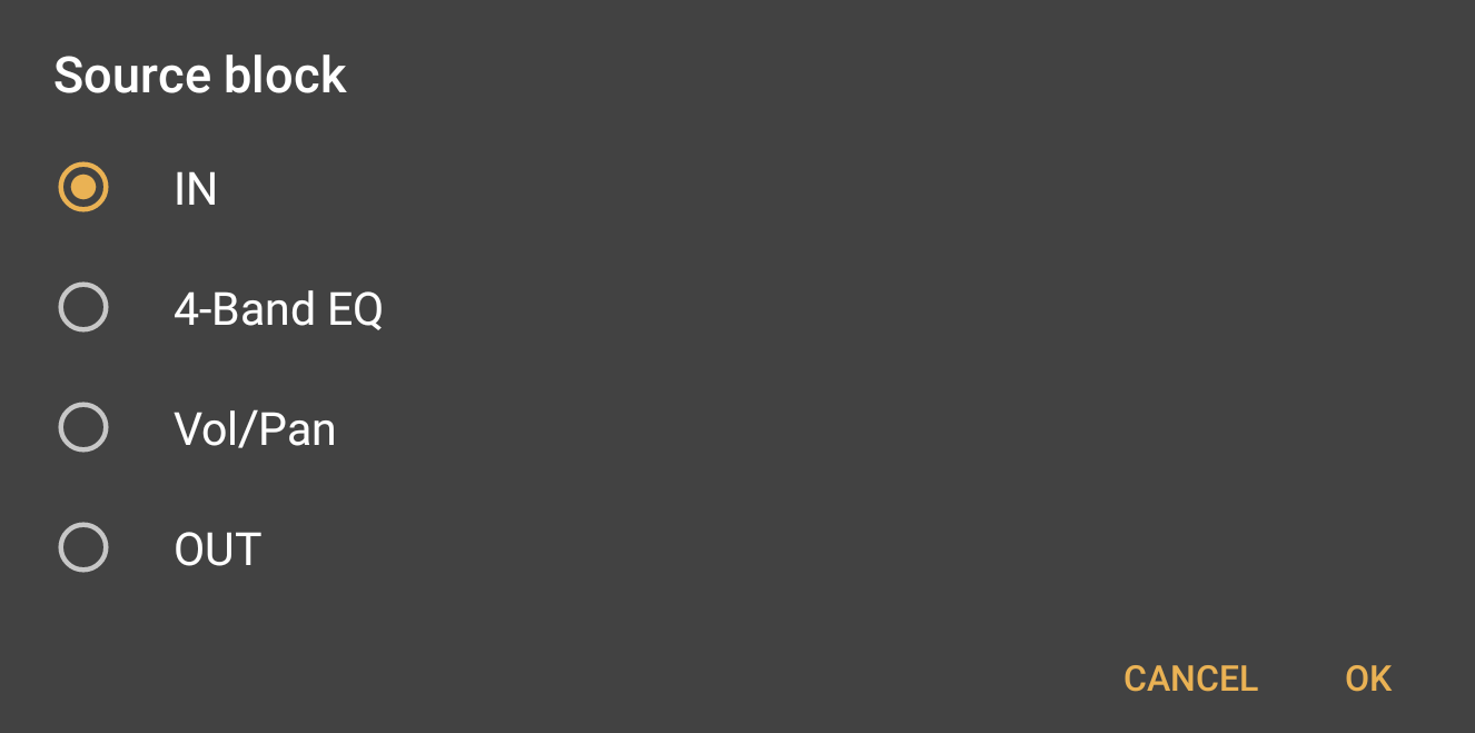 The Source track is the track which will be monitored by the compressor and will be used to trigger the compression being applied when its signal goes above the Threshold set. Pressing OK will then open the Source block dialog, below.