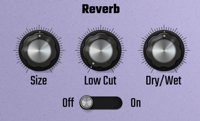 The Dry/Wet dial controls the ratio of 'dry' signal (with no reverb effect) to 'wet' signal (with reverb). It defines the amount of the Reverb effect heard. If this dial is all the way to the left, only the dry signal will be heard. If it is all the way to the right, only the wet signal with the effect applied will be heard.