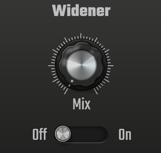 As explained in the Auto Pan section below, the Evolution One synth sound exists in a stereo sound field. The Widener is a clever effect which spreads and widens the stereo effect of the selected preset.