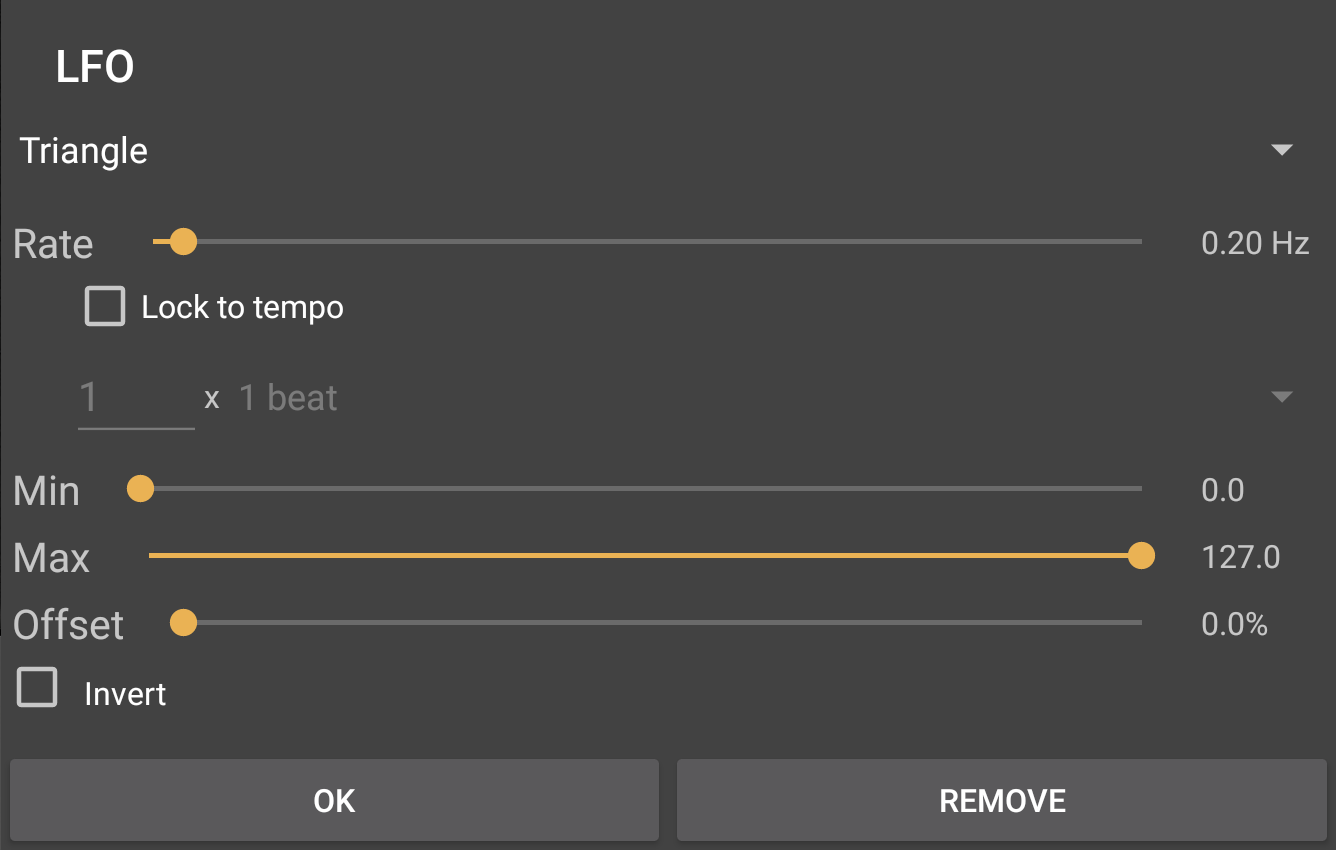 As can be seen, this is where you can define the characteristics for the LFO (Low Frequency Oscillator) which will be used to modify the level of the parameter over time. At the top is the drop-down list to select the LFO waveform shape (Saw, Sine, Square, or Triangle). Next is the Rate of the modulation. This can be set using the slider using a value of Hz (Hertz) or you can Lock to tempo using the checkbox shown. Once locked to tempo, the tempo increment options used for this 'locking to' will become available (they are grayed out in the screenshot above). The tempo increments available are between 1 bar and 1/32 triplet beat, with 24 and 25 frames per second also available. Once a tempo increment has been selected, you can then enter the number of that increment to use for the LFO duration before it starts again. So, for example, if you enter '2 x 1 bar', the LFO modifier will take the 2 bars to complete one full cycle before starting again. Next, the Min and Max sliders allow you to set the minimum and maximum levels for the parameter, between which the LFO modifier will move. Below them, the Offset slider allows you to adjust the starting point on the LFO waveform for the cycle to begin from. Finally, the Invert checkbox, when selected, inverts the LFO waveform (turns it upside down). Click OK to apply the LFO modifier to control the parameter. Opening this dialog again for the same parameter will allow you to alter the settings if required and can also be used to Remove the modifier completely. When a parameter is being modified by an LFO it will be indicated like this