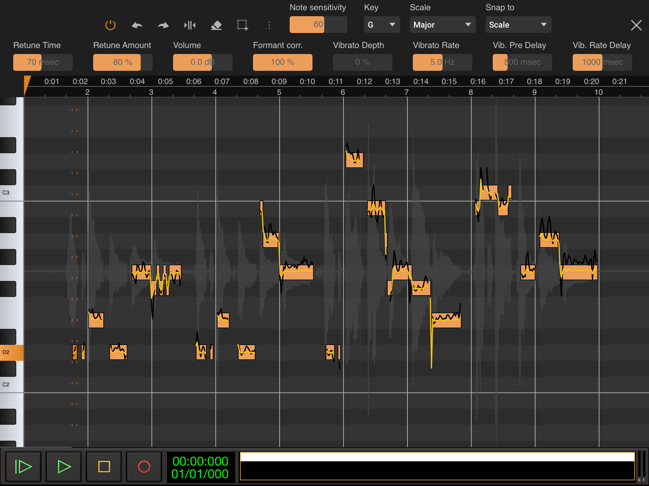 Vocal Tune Studio has two editing modes: 'Pitch and time' and 'Time only'. 'Pitch and time' mode allows you to fully control the pitch of detected notes within your audio file on a piano roll editor with various per-note editable parameters and scale detection. It also allows you to create and manipulate time stretching points to alter the timing of aspects of the recorded performance whilst maintaining the pitch (original or tuned). 'Time only' mode allows you to define stretching points and change the timings within an audio clip whilst always maintaining the original pitch.