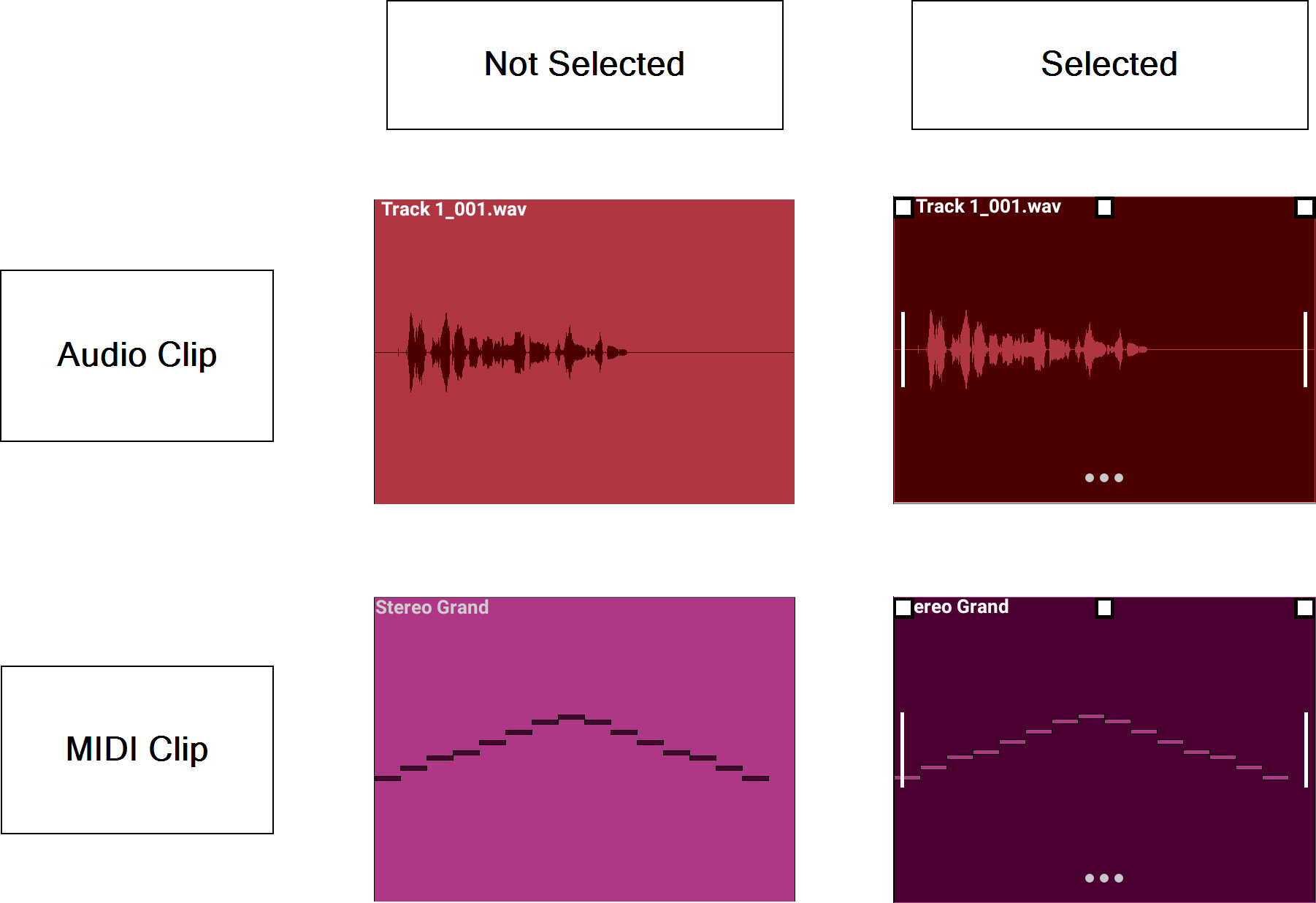 NOTE. These descriptions of clips have been written from the Expert Arranger Screen mode point of view as we feel this mode provides the best overall workflow and experience. If you are using the Beginner Arranger Screen mode you will find that the clips do not have the Three Dot Button or the Clip Trimming Handles shown here. When in this mode, you will need to have the Scroll mode button activated to allow you to long press a clip and open the Clip/Track Options. You will need the Edit