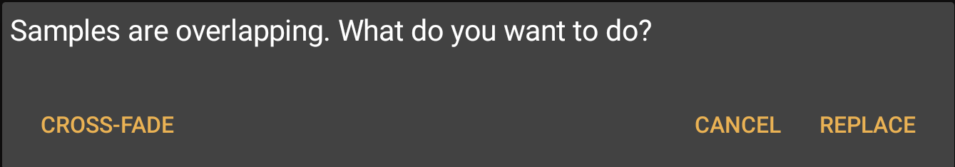 If you want to move your clip on the timeline of its track - or move it onto another track of the same type (audio or MIDI) - tap and hold the central area of the clip and slide it to the desired location. In Beginner mode, the Edit button needs to be activated first. If you drag an audio clip over an existing audio clip you will see the following pop-up.