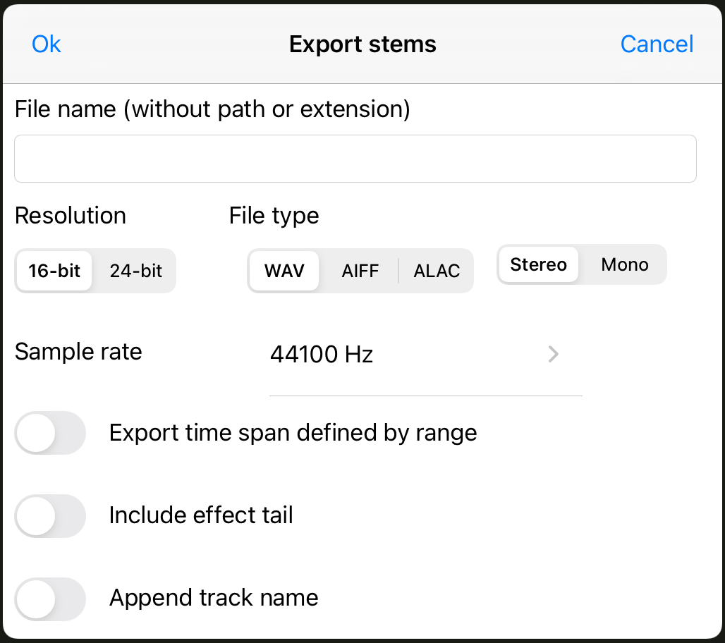 Once you have everything set up as you want it, press OK to export your audio stems. Depending on where you chose to save the audio stems to, they can be found in either the Project folder (where it can be found in the 'Samples' folder), the device Music folder, the device Download folder or (Android 11 and above only) the device Documents folder.