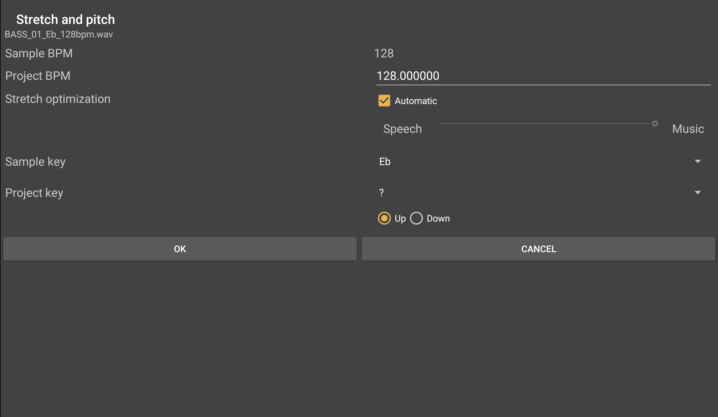 If the sample key differs from the project key, it will need to be pitch-shifted, or transposed, to match the project key otherwise they won't match musically. This can be done by pitch-shifting upwards or downwards until the same key is reached on different octaves. Thus, the Up and Down selections allow you to decide which direction you'd like the pitch-shifting take.