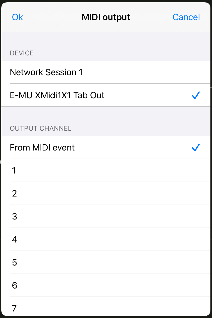 The MIDI Output button opens the MIDI output options seen here.