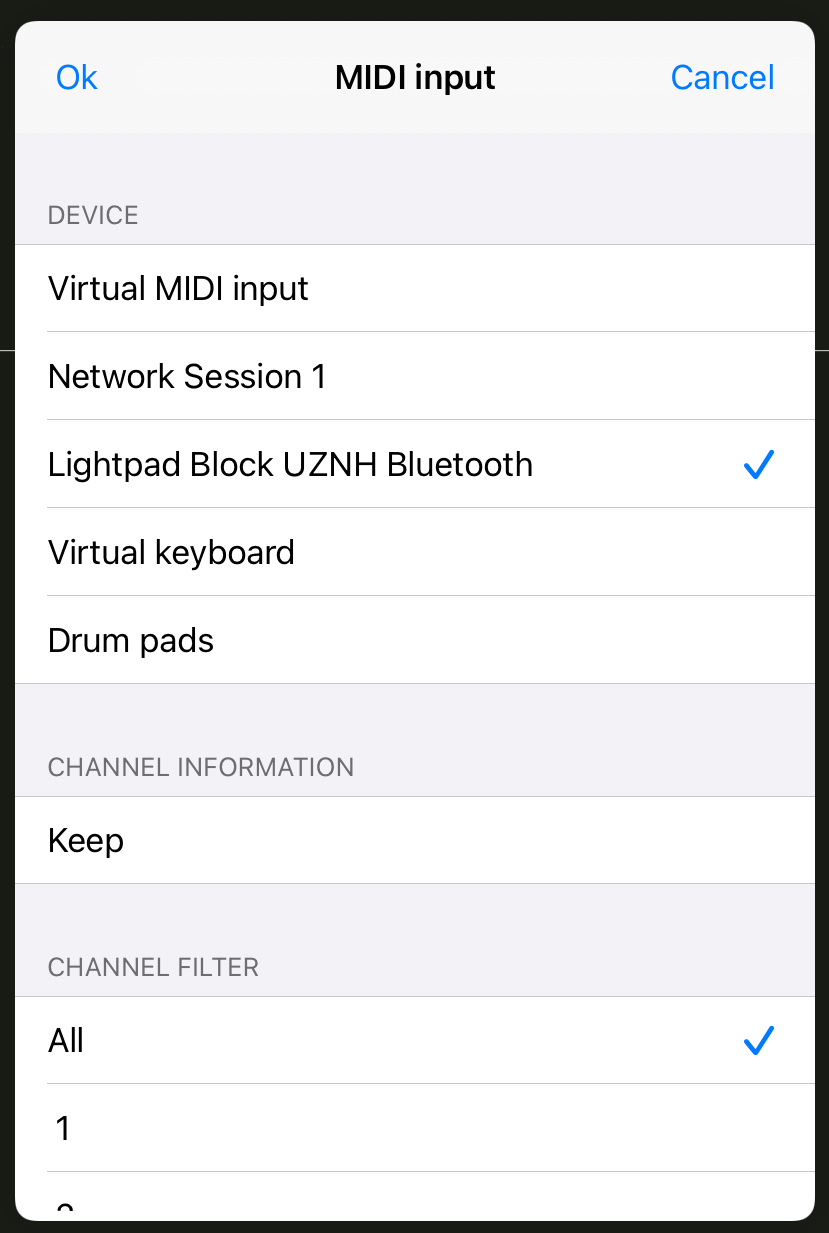 The Channel Information of the incoming MIDI events can be kept when enabling Keep. This is useful for keeping MPE information from for example ROLI devices that require MIDI channel information to be kept unchanged. For ROLI devices, this option is turned on by default. When this option is disabled, then the app will override the MIDI channel.