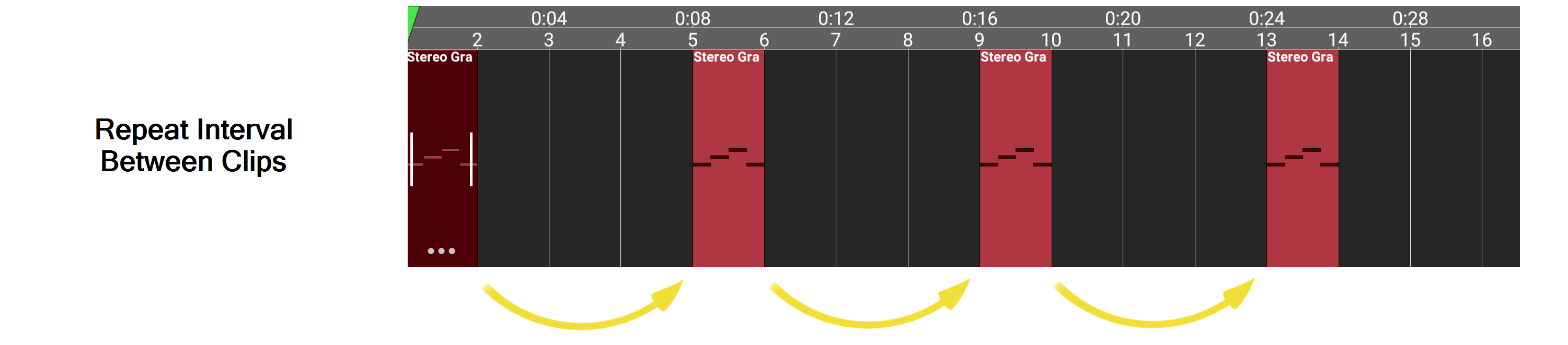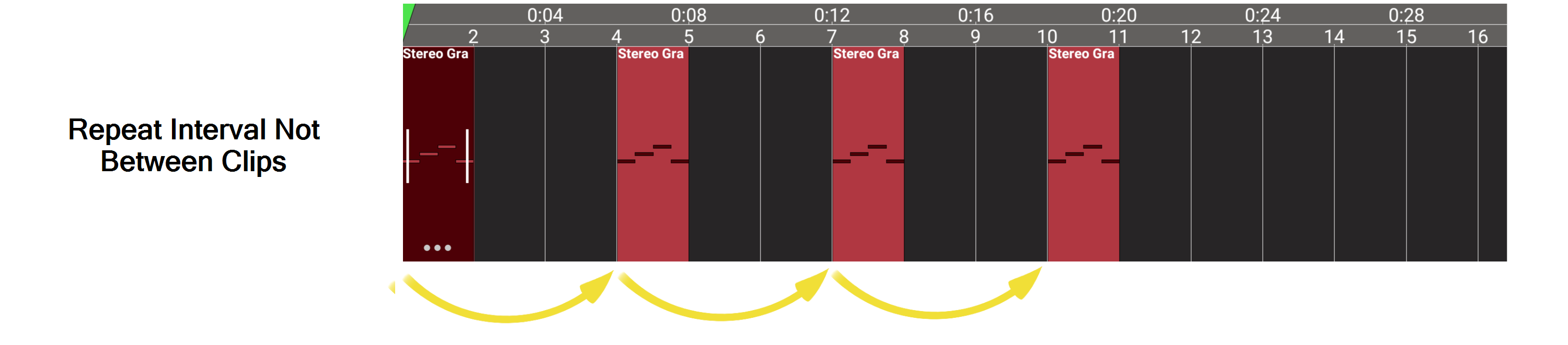 So, in the above examples, you can see how the selected clip is one bar long. The repeat dialog has been set to make three repeats with an interval of three bars. As you can see, when the repeat interval is set to 'Between clips', the three bar interval is applied between every clip meaning the three repeats start on bar five, nine and thirteen. When 'Between clips' is not selected, the three bar interval is applied based on the starting position of the original, and every subsequent clip. As such, the three repeats start on bar four, seven and ten.
