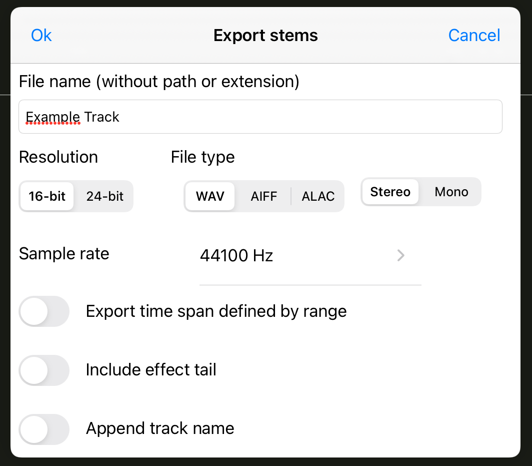- File type is where you can select the file format for your export. The options are WAV, AIFF and ALAC. WAV and AIFF are lossless audio types, whereas ALAC is compressed. If you want to send someone an audio file by email or perhaps social media, it may be best to select ALAC to keep the file size small. Trying to email a lossless audio file will usually fail due to the file becoming too large.