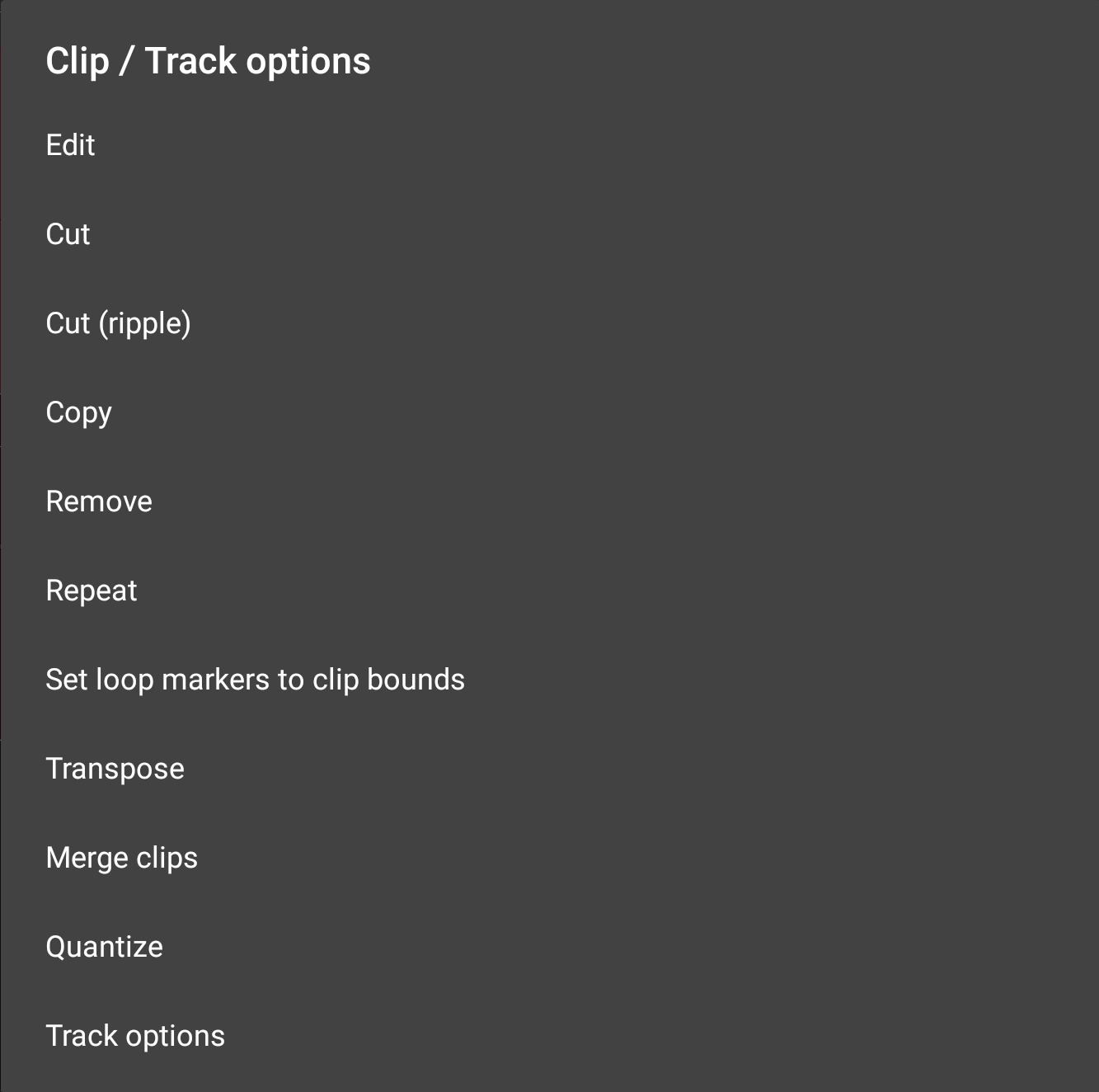 To open the Clip/Track Options menu in Beginner mode, please activate Scroll mode first, then long press on a clip to open the menu. In Expert mode, please tap on the three dot button of a selected audio clip.