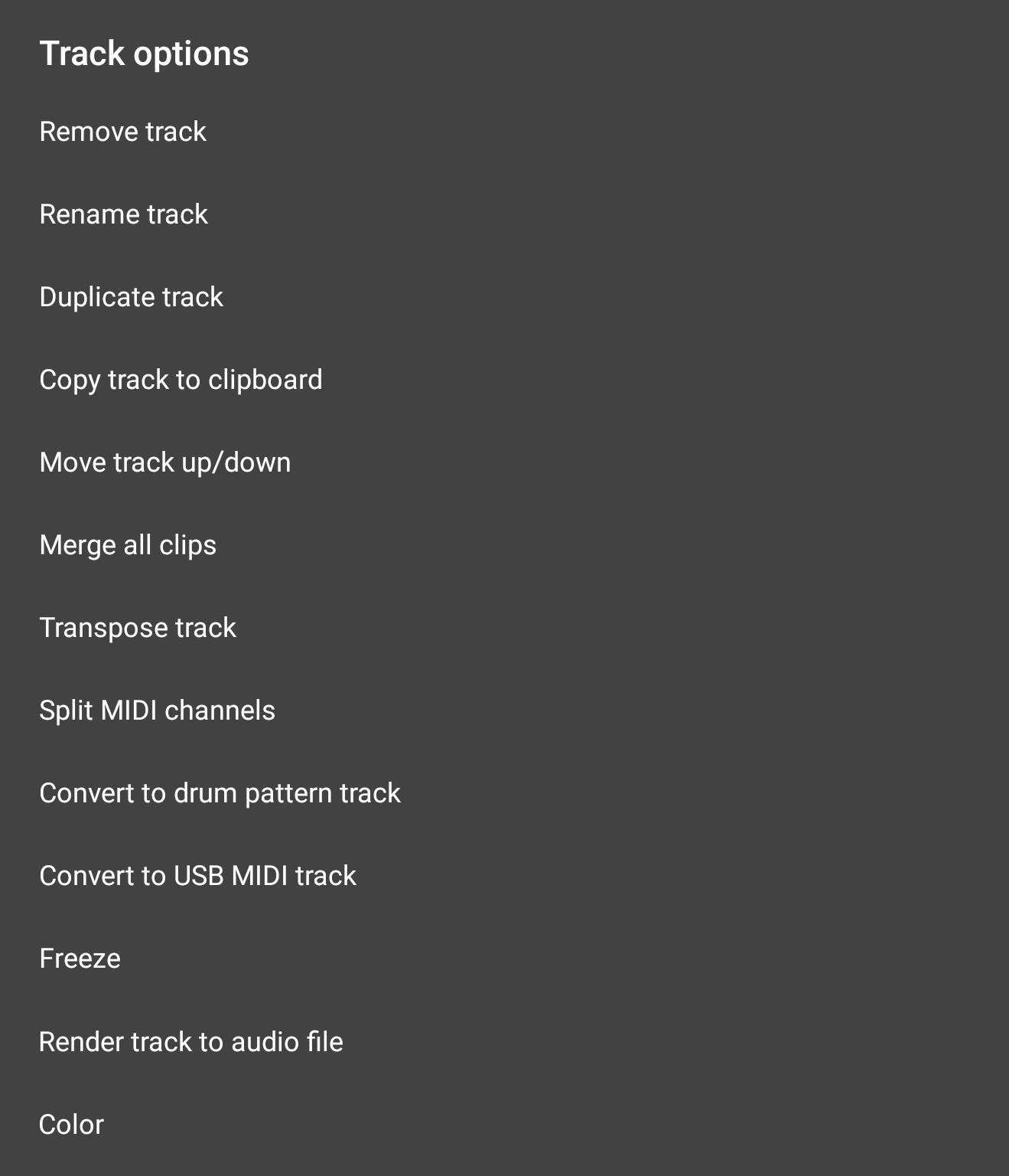Remove track removes the entire track, including all of the clips on it, from the project. This action can be undone using the Undo button if selected by mistake. Unlike audio tracks where samples remain stored on the device after removing audio clips or audio tracks, MIDI clips only remain in memory or in the project file. This means that deleting MIDI clips cannot be undone after leaving the app or the project.