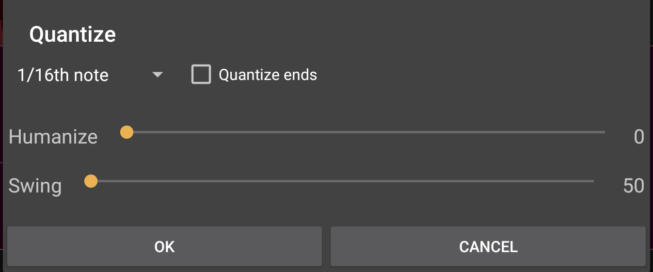 Quantize allows you to automatically shift the horizontal (time) position of your MIDI notes on the Piano Roll for the selected clip. Quantization can be a very useful and powerful feature when working with MIDI. It can be used to nudge the notes' position so that they are perfectly in time with the tempo, but the Quantize function in Audio Evolution Mobile also has more subtle and sophisticated functionality available. Pressing Quantize opens the following dialog.