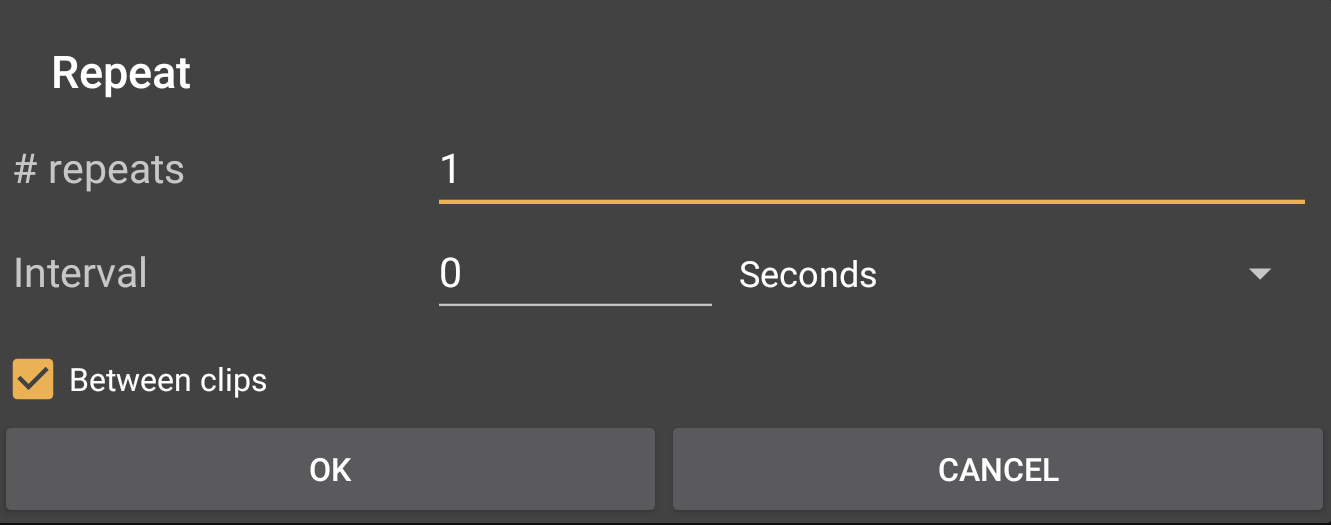Repeat allows you to create multiple repeats of the selected clip on the track. As can be seen below, pressing Repeat opens a dialog which allows you to specify the number (#) of repeats and if you want to specify intervals at which the repeats will appear you can also do that too. The drop-down intervals selection allows you to choose between Seconds, Milliseconds, Bars, Beats, 1/8 Notes and 1/16 Notes.
