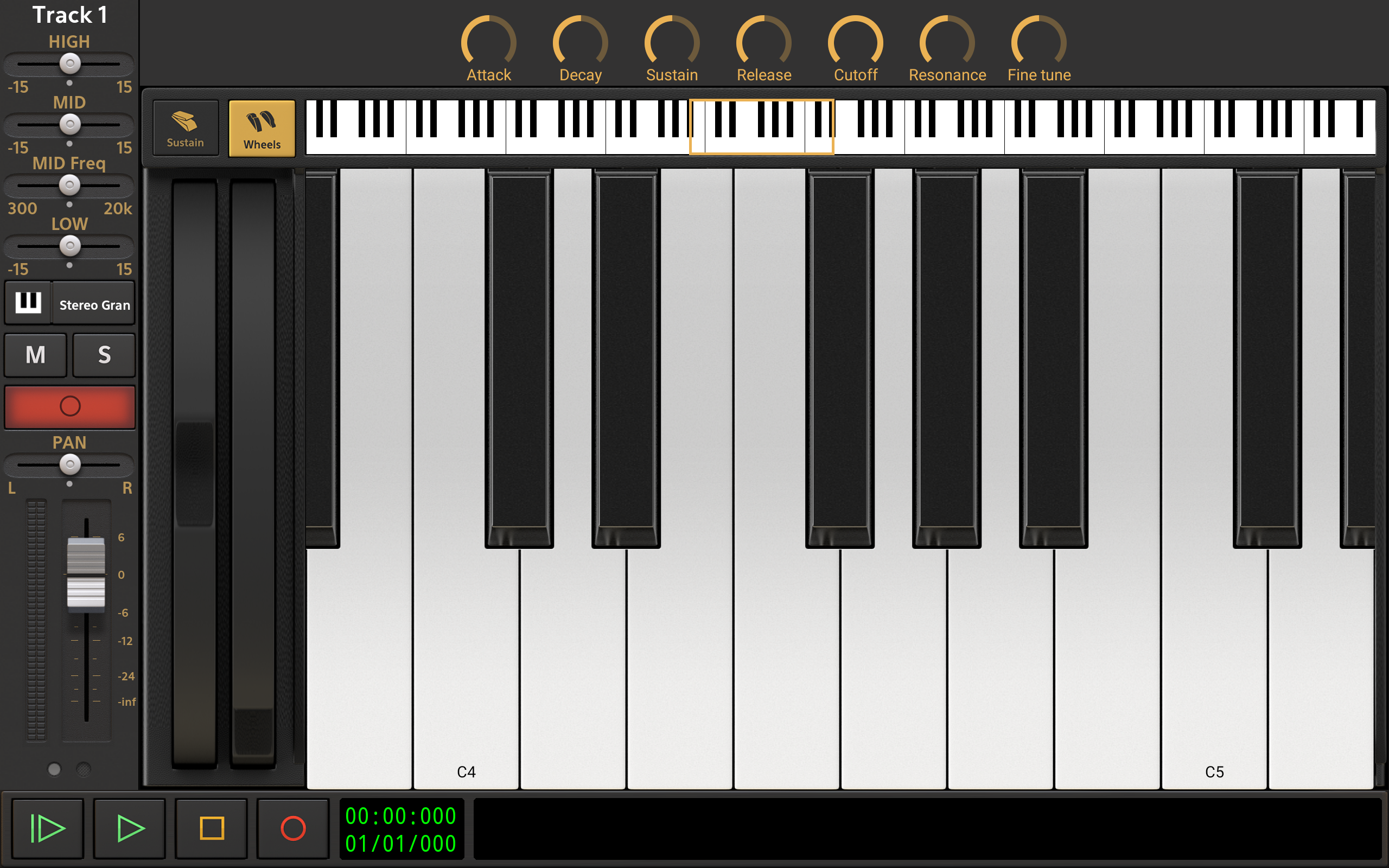 MIDI compositions can be created manually using the Piano Roll Editor or the Drum Pattern Sequencer, but it is also possible to live record your MIDI information using the onscreen keyboard, the onscreen drum pads, a connected external MIDI keyboard or other external MIDI equipment. You can either use the virtual instruments that you can select in the app (Soundfonts, Evolution One and Flowtones synths, Audio Unit instruments and IAA instruments) to produce audio on your device or drive external MIDI equipment like synthesizers connected by USB MIDI or Bluetooth.