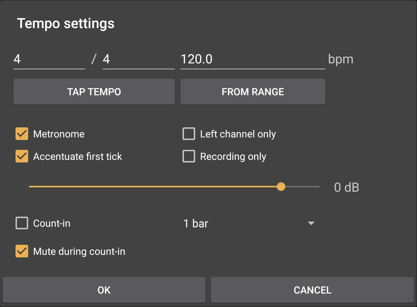 The first thing in the Tempo settings is the Time Signature. In the screenshot above, showing the default tempo settings, it is set to the most common time signature of 4/4. A time signature lets you know how the music is to be counted. The first number in the 'fraction' tells you how many beats there are per bar/measure. The second number indicates what length of note each beat represents. Common lengths of note are half notes (2), quarter notes (4), eighth notes (8) and sixteenth notes (16). So, in the example above, the time signature is 4/4, meaning you count four beats per bar and each beat represents a quarter note. Tap on the numbers shown to change them and enter your own choice of time signature.