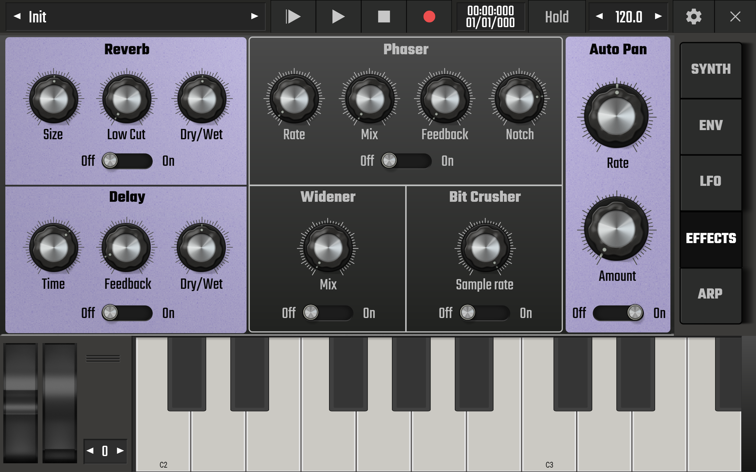 The Evolution One Effects Page offers you six high quality effects which can be creatively applied to your sound within the synth itself. Don't forget, you can also apply any of Audio Evolution Mobile's other effects outside the synth screen by accessing the FX Grid from the synth track channel on the Arranger Page.