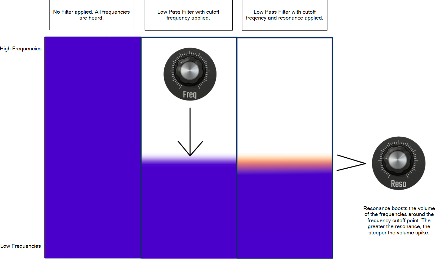 A Low Pass Filter lets the low frequencies pass through to be heard whilst cutting off the higher frequencies as can be seen in the diagram above. The Cutoff Frequency, which defines the point from which only the lower frequencies are heard, is set using the Frequency dial. When it's all the way to the right it is letting all of the frequencies through and the filter is having no effect. The more it is turned anticlockwise, the more frequencies are cut away until only the very lowest ones can pass through and be heard on the far left hand side.