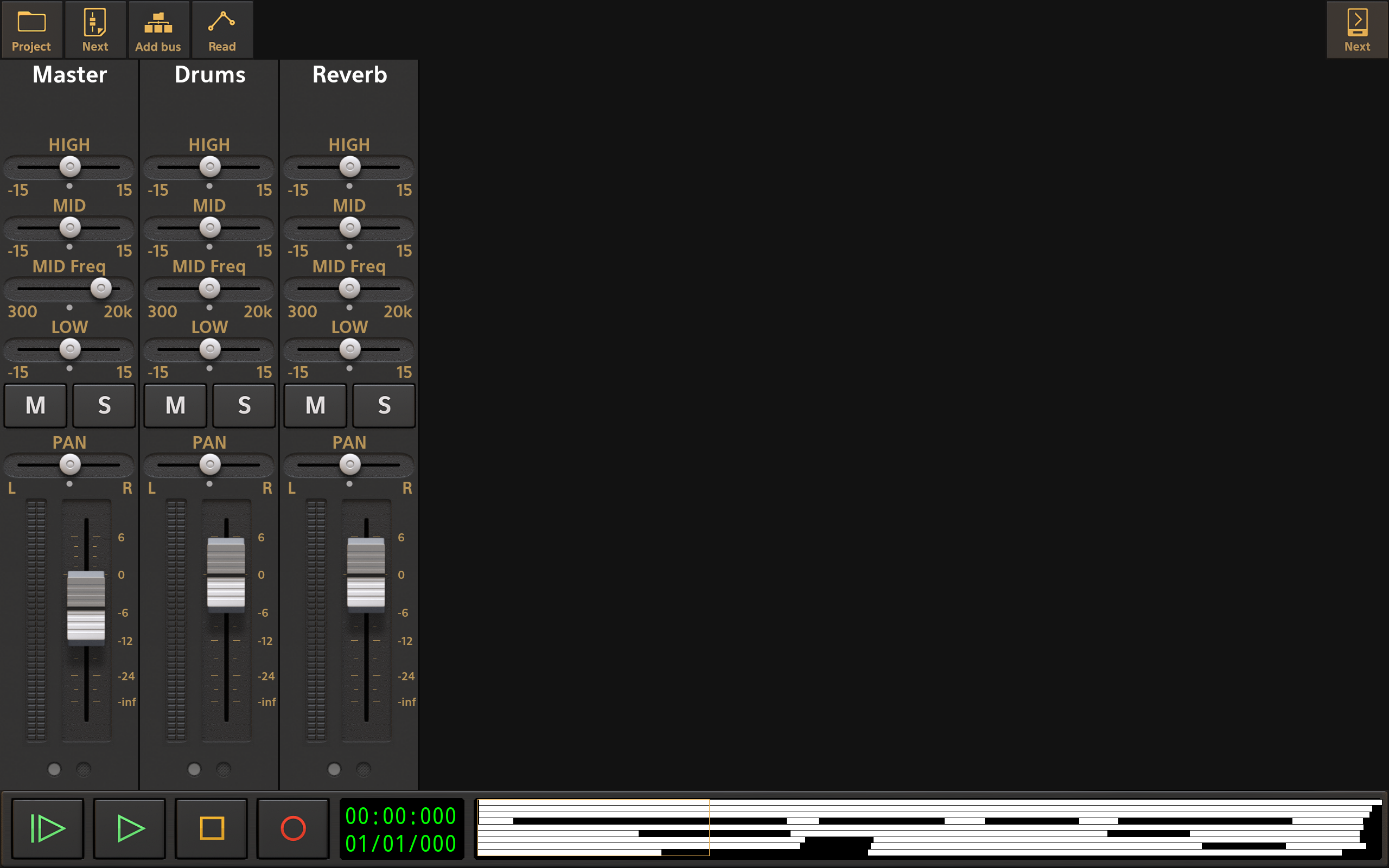 Audio Evolution Mobile has two mixer screens; one displaying all of your project's tracks and another displaying the Master output channel and any Group/auxiliary bus channels present in your project. They can be accessed by pressing the Next button, top right, on the Arranger Screen: one press takes you to the Mixer Screen, another takes you from there to the Master Screen and one more takes you back to the Arranger Screen.