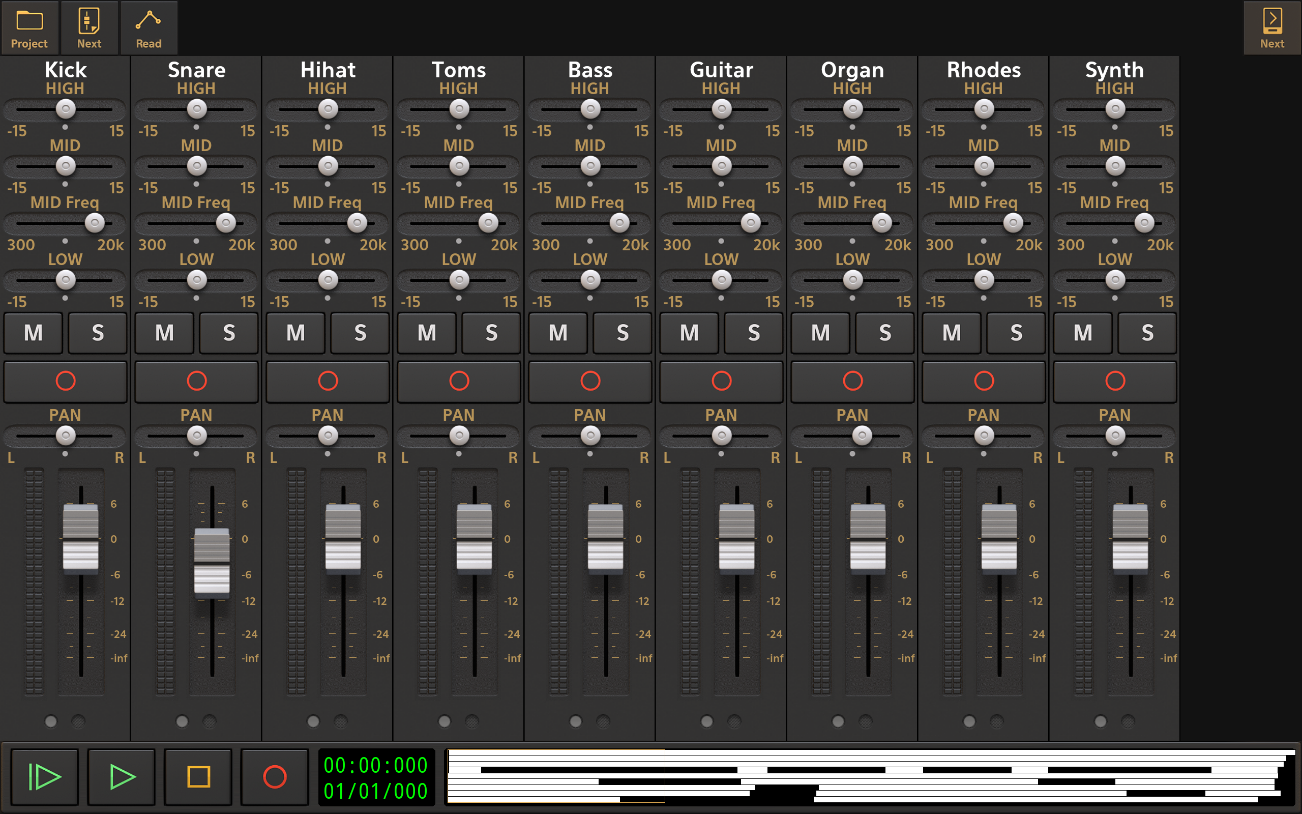 This screen displays the Channel Strips of all of the tracks in your project next to each other in the manner of a mixing console. If there are more tracks in the project than will fit on the screen all at once, you can swipe to the left over the names on the channel strips to access the channel strips of tracks which are not displayed initially.