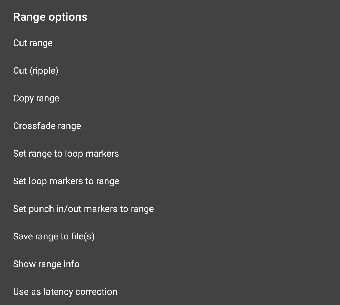 Copy range copies the selected range to the clipboard, ready to be pasted elsewhere. You can also copy the selected range to the clipboard without opening these Range options using the Copy button on the Arranger Screen.