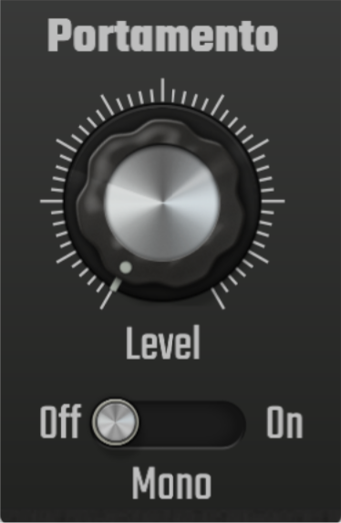 Use the Level dial to apply more or less portamento, slide, between notes. Portamento can only be applied when Mono mode is switched on.