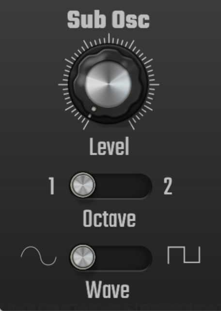 The Octave selector allows you to select whether the sub-oscillator plays at one, or two octaves below the note triggered.