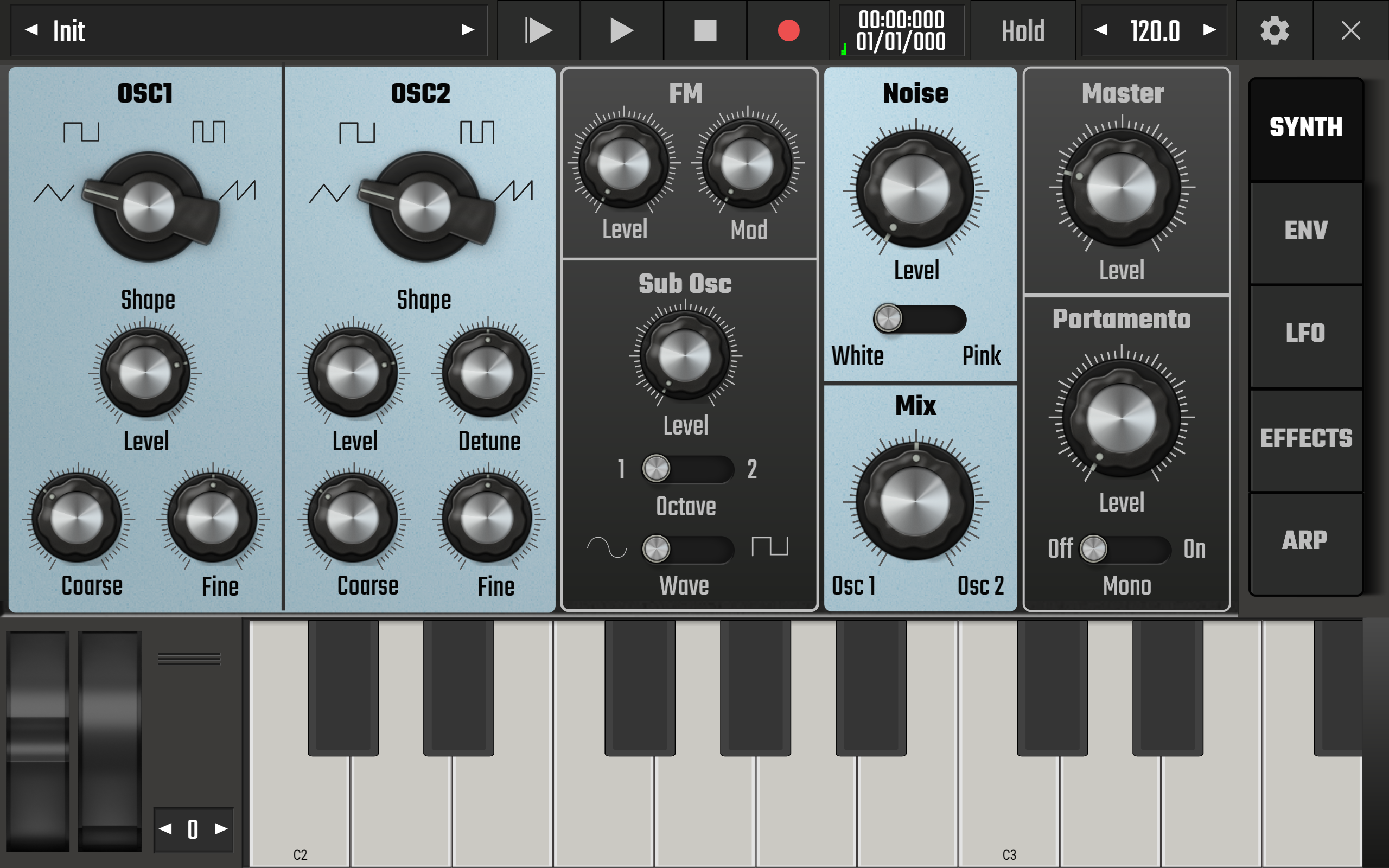 Coarse tuning controls the note of the oscillator relative to the note pressed on the keyboard (or triggered on the piano roll). The default value is the same as the note triggered but it can be moved up or down in semitones (between -12 and +24) using the dial. The Playback Timer panel will display the semitone setting as the dial is moved. As always, double tap on the dial to return it to its default value. Try raising the second oscillator by an octave (12 semitones) or a fifth (7 semitones) for easy examples of what can be achieved with Coarse tuning.