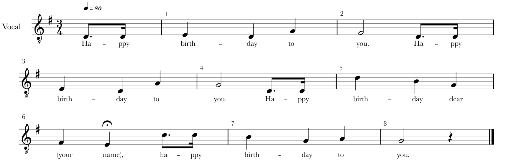 For this example, the song Happy Birthday To You has been chosen. This song is now in the public domain but is generally accepted to have been originally derived from Good Morning To All, written by Patty and Mildred J. Hill in 1893. Most importantly, it was chosen because it is hopefully a tune which is familiar to almost everyone who reads this.