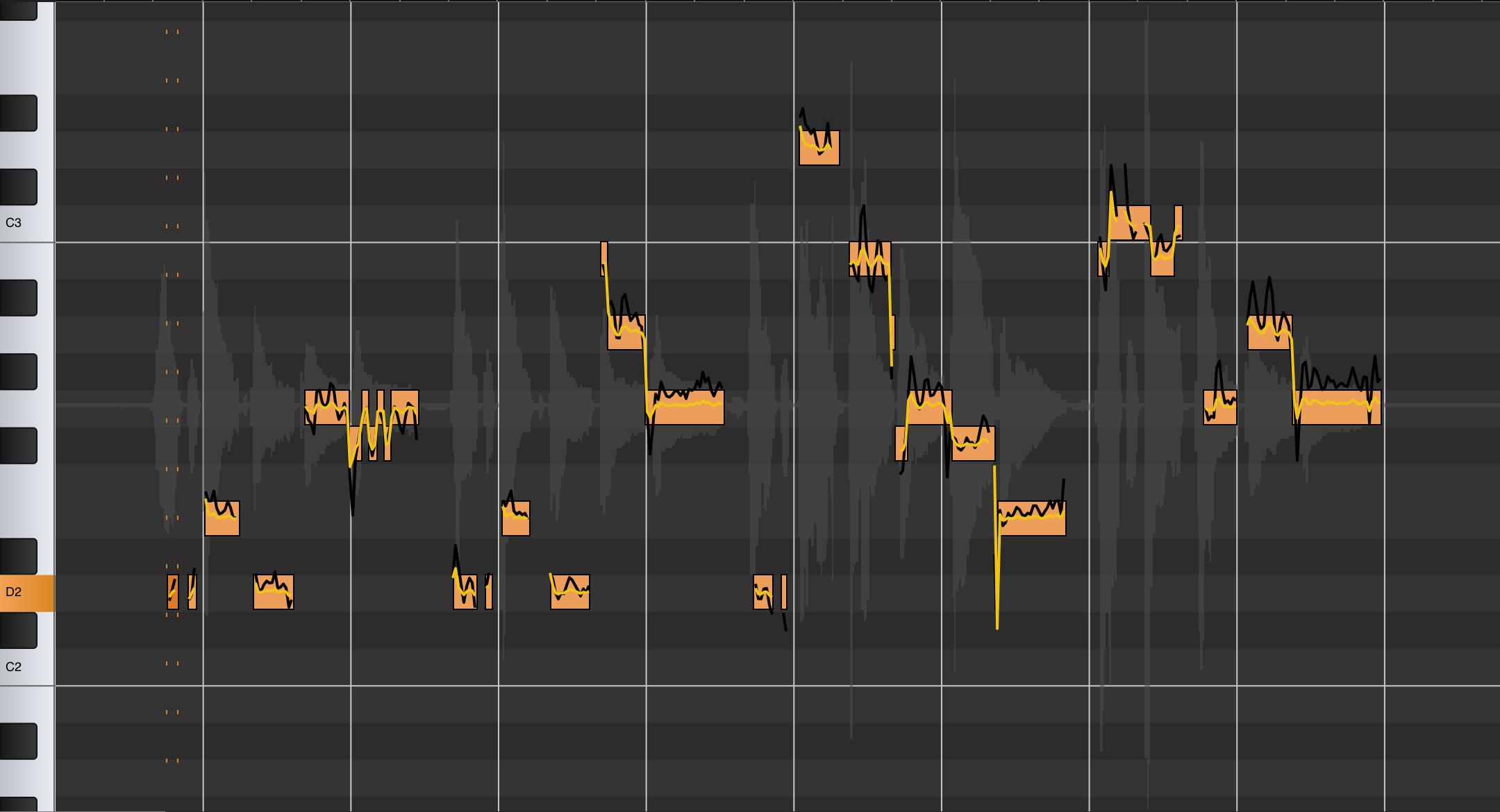 So, instead of one note representing the sung word, starting at the third measure, we have six notes alternating between F#2 and G2 indicated here by the white numbers above them. Now, it is possible that this pitch fluctuation was deliberate on the part of the performer in which case obviously you would not want to remove it but that wasn't the case here so we need to make some corrections ourselves.