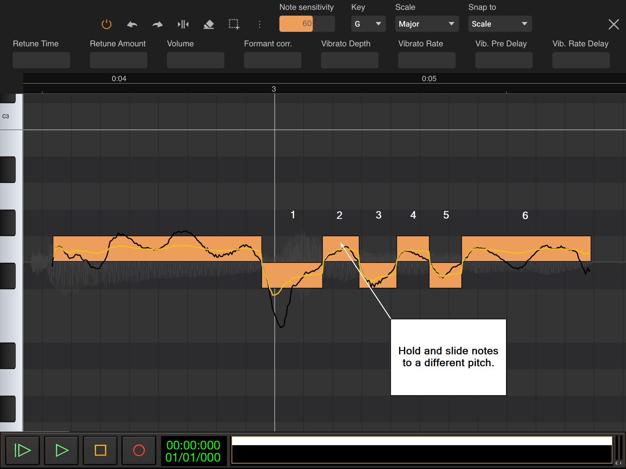 Here, then, is the Happy Birthday vocal recording opened in Vocal Tune Studio. Vocal Tune Studio has identified pitches and grouped them together as notes (according to the Note sensitivity setting). It has then applied its default retuning settings (as long as Start with last used preset hasn't been selected in the Settings) to all of the notes and snapped them to their closest correct pitches within the key of G Major. In the background, in gray, can be seen a representation of the original audio waveform.
