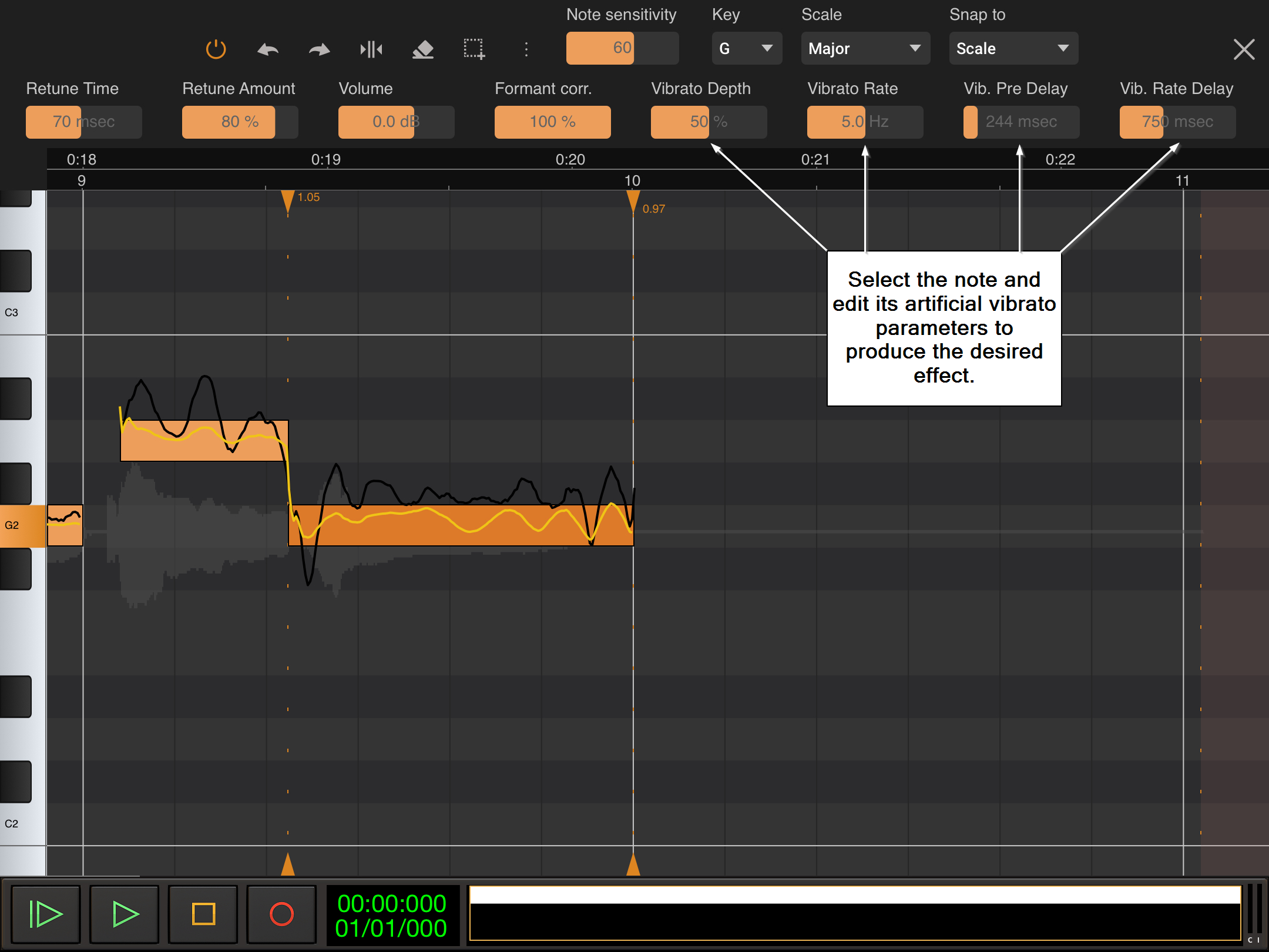 Simply alter the artificial vibrato settings to achieve the effect you are after. Don't forget that you can easily double tap on any of the retuning parameter sliders along the top to get the option to either enter a precise value using the onscreen keyboard or return the parameter to its default value. In the example above, you can see that Vibrato Depth has been set to 50%, Vibrato Depth is at 5.0 Hz, Vibrato Pre Delay is set to 244 msec and Vibrato Rate Delay is set at 750 msec. As you can see, the artificial vibrato can be seen taking effect on the yellow retuned pitch line within the selected final note; nothing at first because of the pre delay and then, because of the rate delay, it slowly comes in before reaching its full speed and depth.