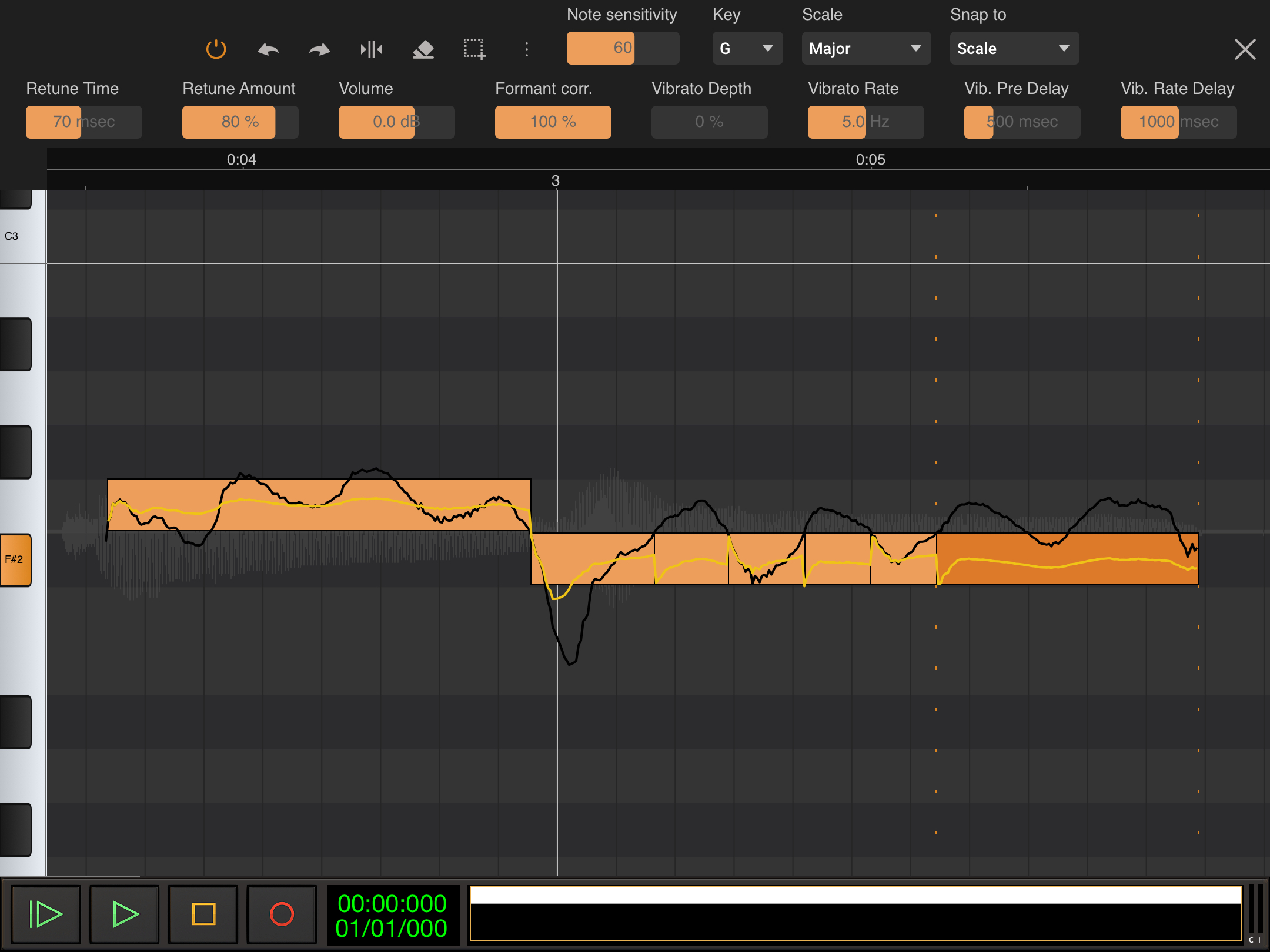 Thirdly, Vocal Tune Studio gives us the yellow line which represents the retuned pitch. As you can see, it is a much more precise indication of whats happening than the notes on the piano roll and it changes accordingly when changes are made to most of the retuning parameters which become available when a note or notes are selected. It is from this yellow line that we can see why simply moving all of the notes to the correct pitch hasn't given us the result we're after. As you can see, there are troughs or peaks in the yellow line at the beginning of every note after the first one so we need to fine tune the retuning parameters for these notes.