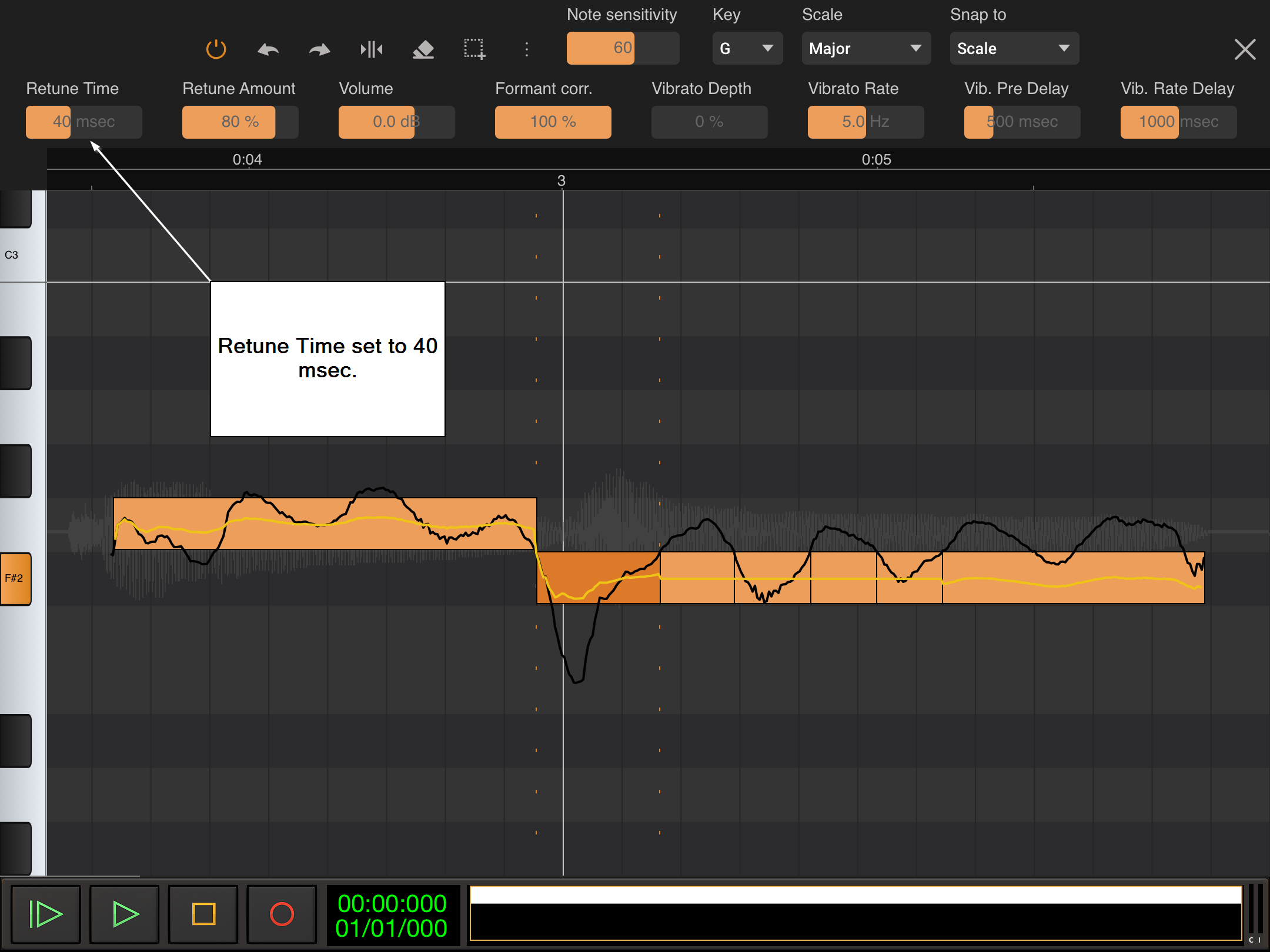 To correct this, the first note has been selected on its own by tapping on it once. This makes its individual retuning parameters available above. In this instance, to pull the retuned pitch closer to the exact pitch of F#2, the Retune Time has been reduced to 40 msec. This means the retuning is applied more quickly, pulling the yellow line within the overall F#2 note on the grid. The Retuning Amount has been left at its default level to retain some of the natural pitch fluctuation present in the original performance, the same as the final note of the six, to preserve the naturalness of the sung word.