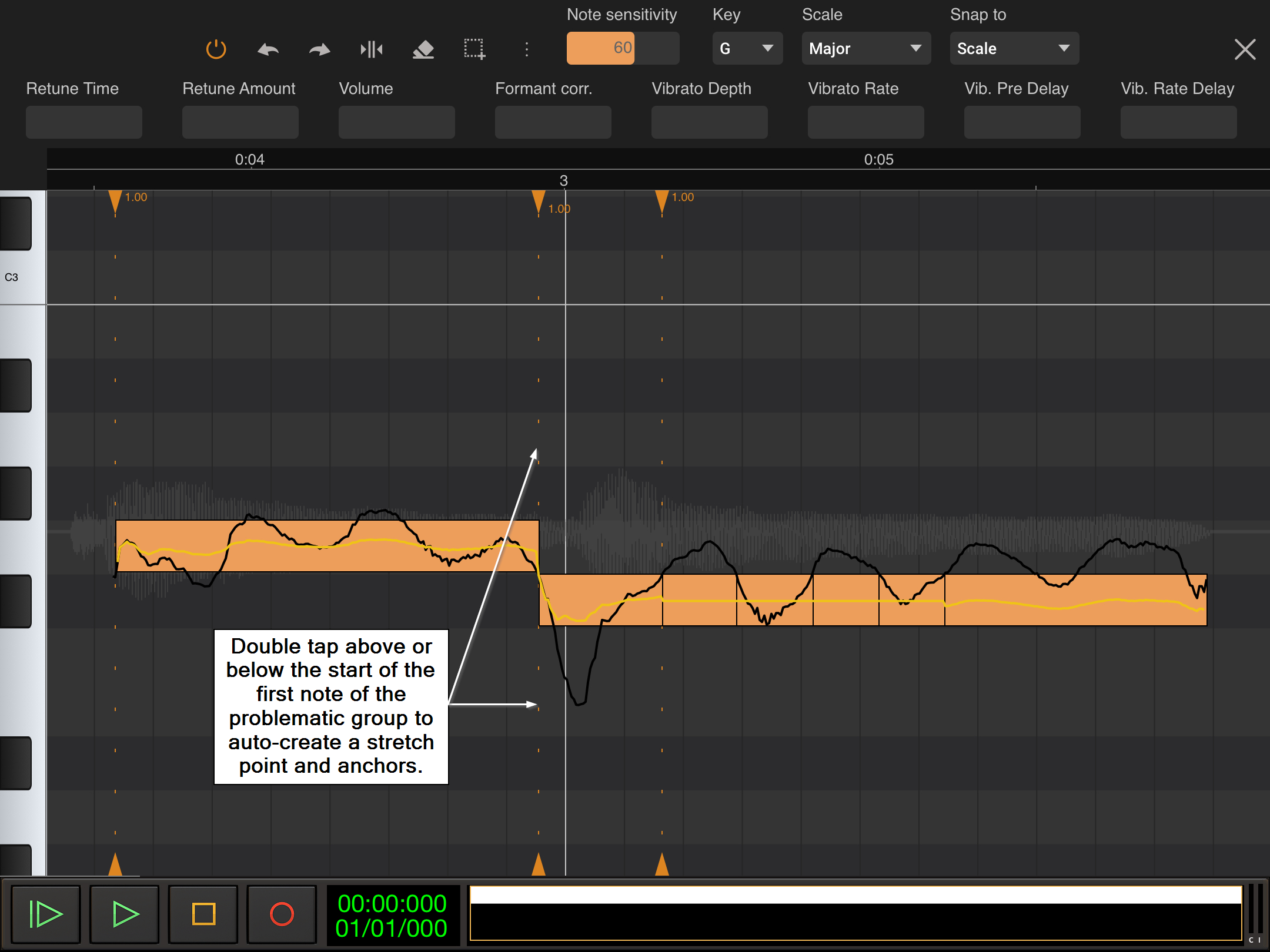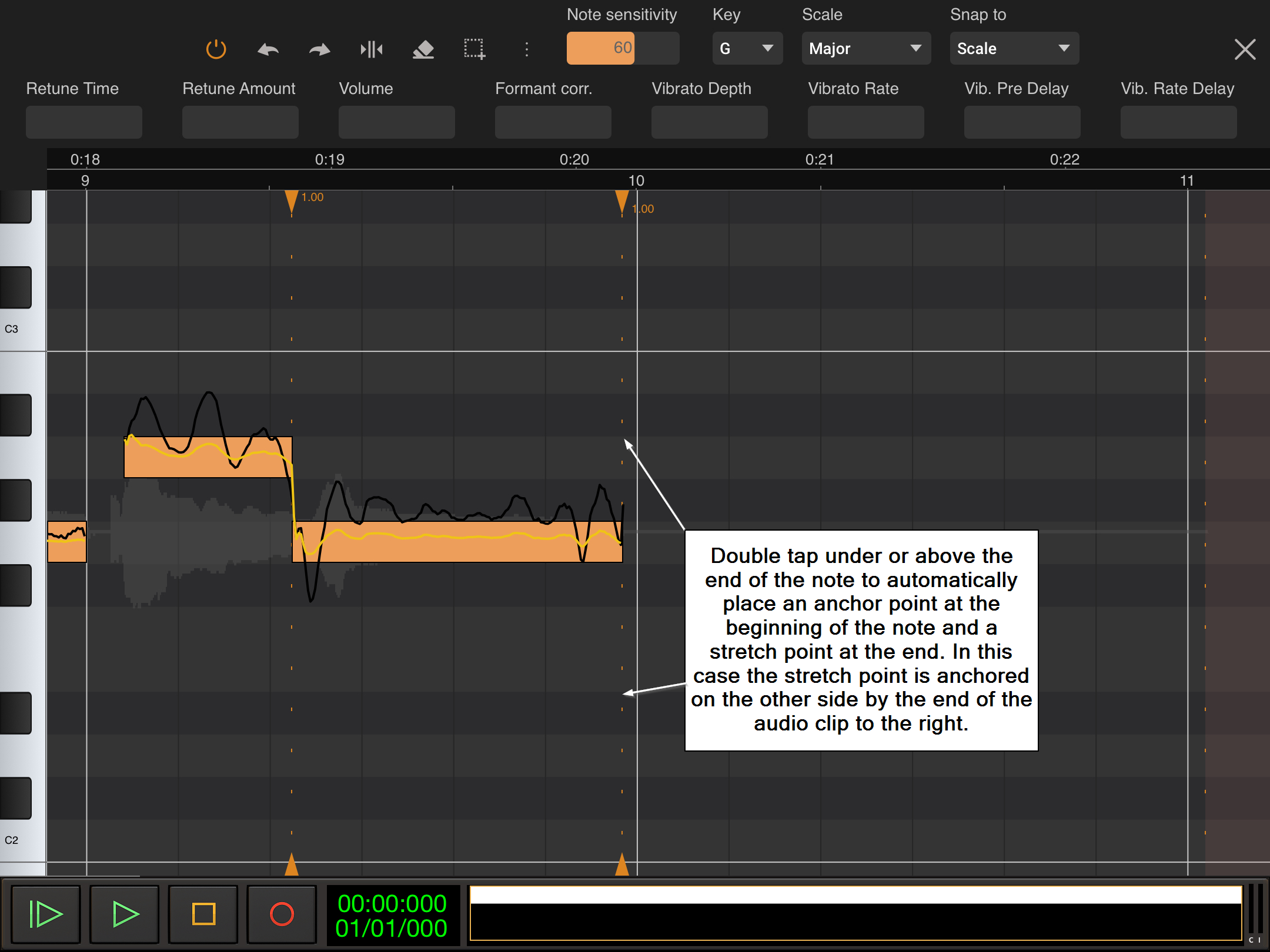NOTE. If you double tap in the gray grid area within the horizontal duration of a note, rather than directly under or above the start or end of a note, a single anchor/stretch point will be created. This, in combination with auto placed anchor/stretch points, will allow you to time stretch within notes if required. Please remember the Undo function to remove misplaced anchor/stretch points and be aware of the other anchor placement modes available as detailed here.