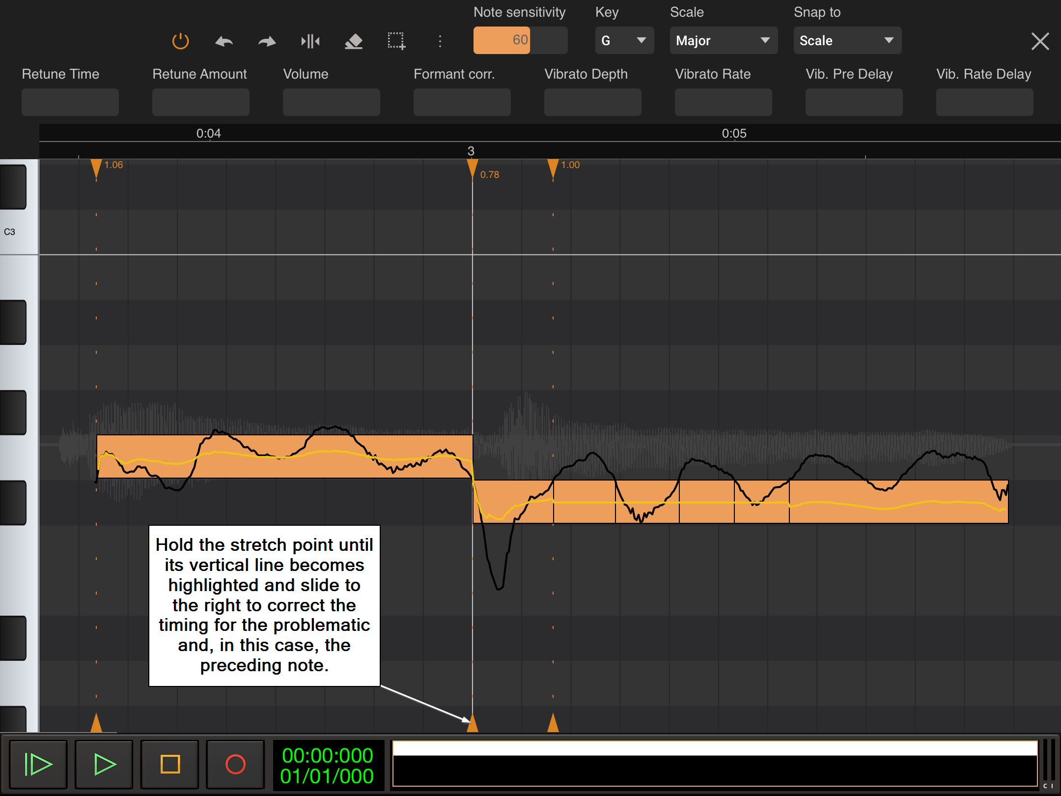 Time stretching within Vocal Tune Studio's Pitch and Time mode is fully explained in the section here. That section also explains the different settings available for the creation of time stretching anchor points and stretch points. In this example we are using the default mode. In this mode, automatic anchor points and a stretch point can be created by double tapping anywhere in the gray grid space directly underneath or above the start or the end of a note. Ordinarily, double tapping under/over the beginning of a note will create an anchor point at the end of the chosen note, place another anchor at the end of the note preceding it on the grid and place a stretch point between them at the beginning of the chosen note. Double tapping under/over the end of a note will place an anchor point at the beginning of the chosen note, another at the beginning of the note which follows it on the grid and place a stretch point at the end of the chosen note.