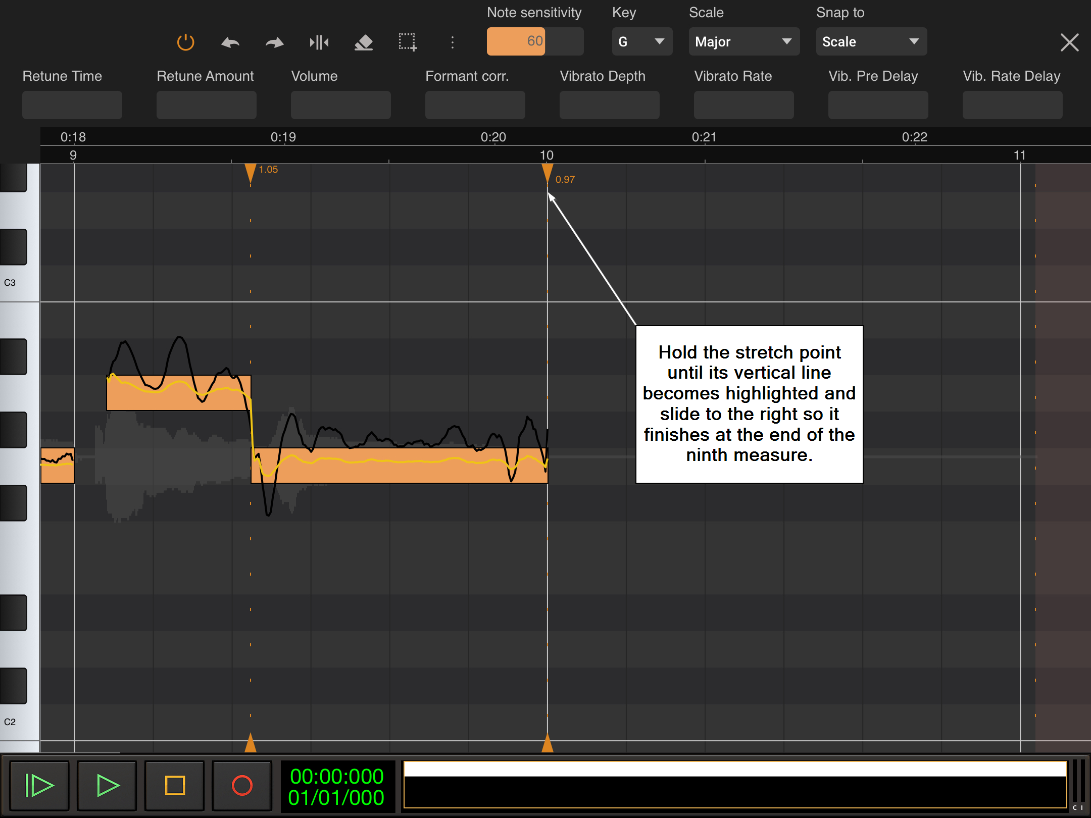 Before we apply the artificial vibrato, we want to check that everything else looks okay with the note. In this case, the default retuning settings have done a great job placing the quantized note at its correct G2 position and have subtly applied the retuning so that no further adjustment is required to the Retune Time or Amount. We can see, though, that the note stops just before the end of the ninth measure, so let's time stretch it a little so it ends perfectly on time. This time we want to double tap under or above the end of the final note so that the stretch point is placed at its end. As can be seen above, this automatically (using the default anchor placement setting) places an anchor point at the beginning of the final note, places a stretch point at the end of it and, in this case, because there is no note after this one, the end of the clip automatically serves as the anchor point on the right hand side. (If there were another note after this one, an anchor point would be automatically place at its start point).