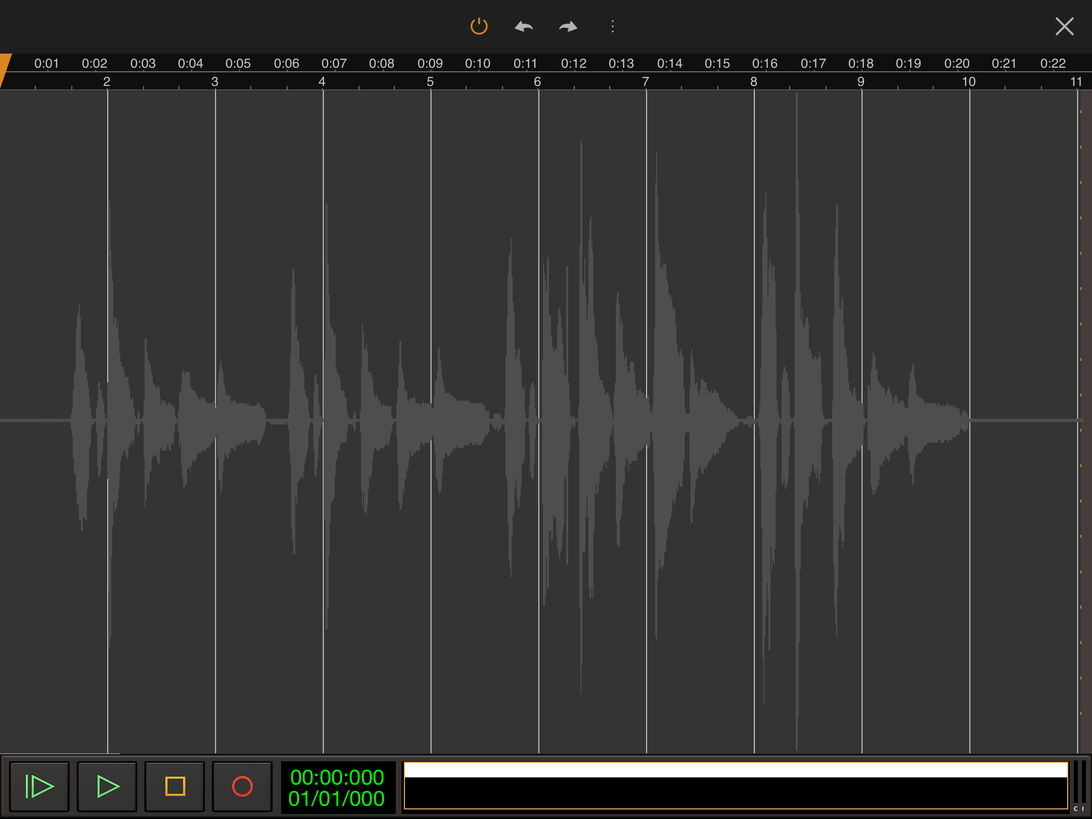The screenshot below shows the clip used in the tutorial opened in Time only mode. As you can see, the audio waveform is shown in light gray across the center of the timeline display. A full guide to the user interface can be found here.