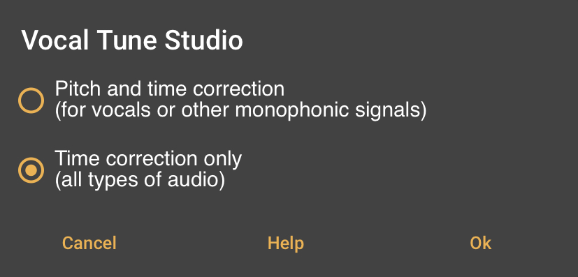 This allows you to select which mode Vocal Tune Studio will open your audio in. Select Time correction only and tap Ok.